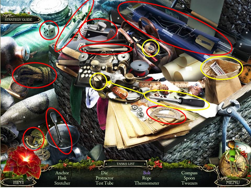- Multi-move items include opening the paper bag to retrieve the thermometer, using the screwdriver to loosen the bolt, and looking inside the handbag to get the compass.