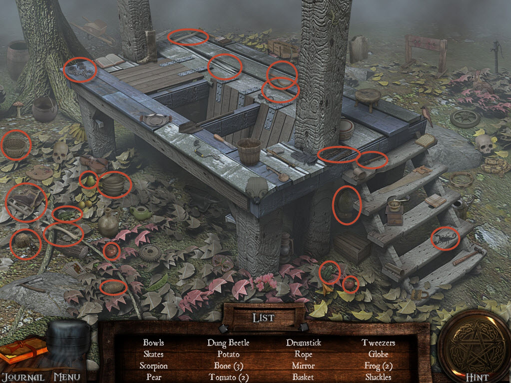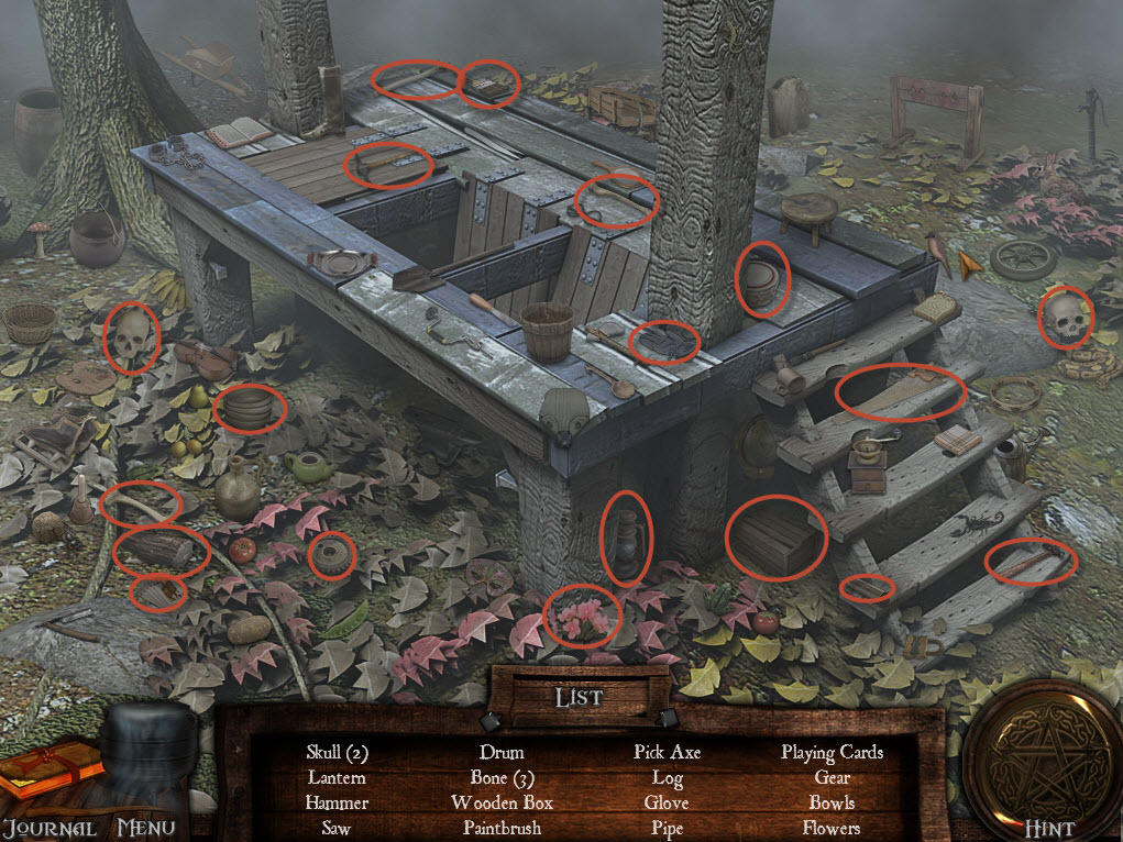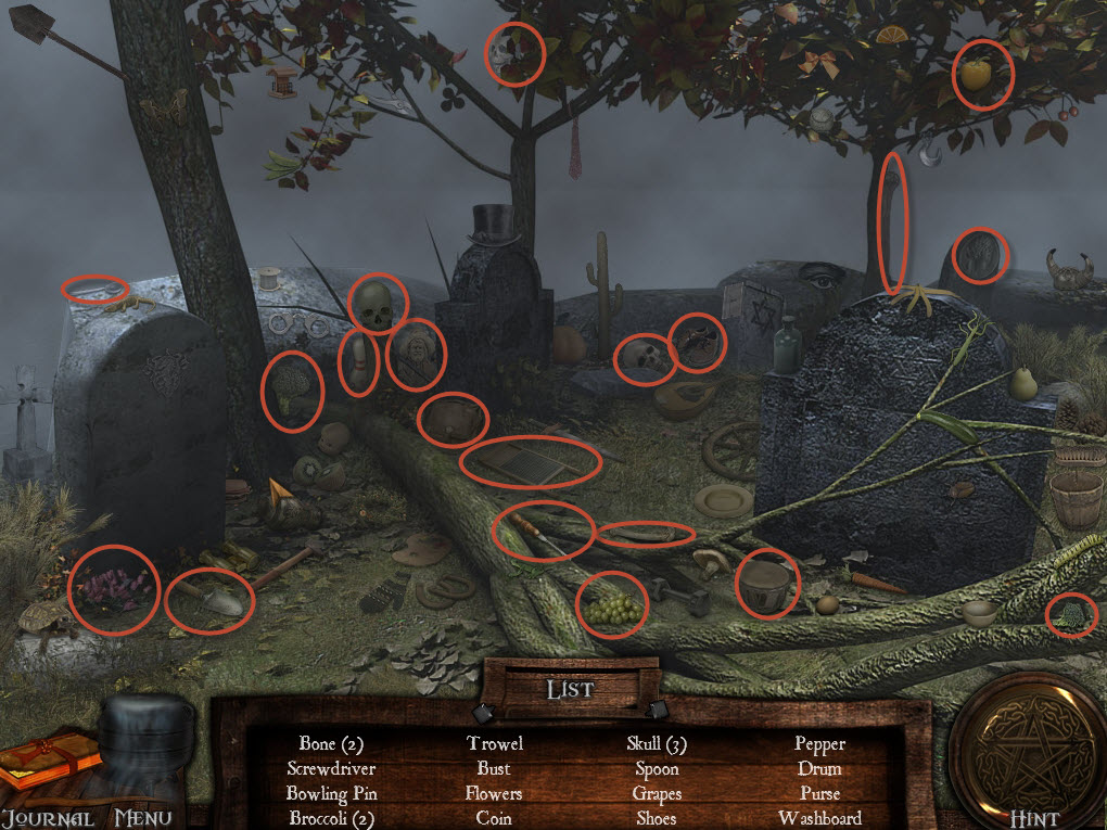 Go back to the town crossroads and left to the cemetery. Complete the Hidden Objects puzzle to collect the screwdriver. Return to the fork in the road and go right to the Gallows.