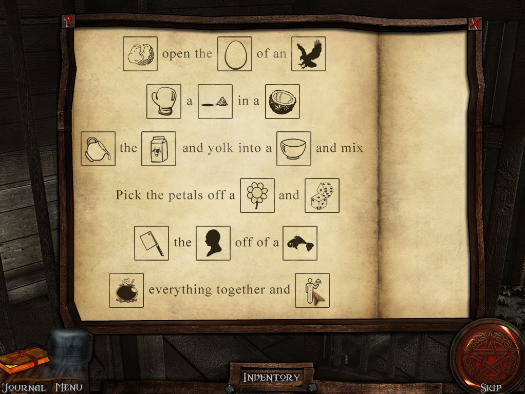 Examine the door. Use your metal cutters to open the chain and go inside. Click on the book to begin a recipe puzzle. See the picture for the solution.