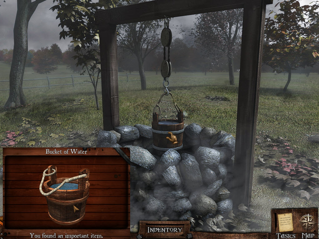 Go back to the crossroads and toward the farm. Continue down the road until you come to the well. Attach your pulley system to the hook at the top of the well, and retrieve the bucket of water.
