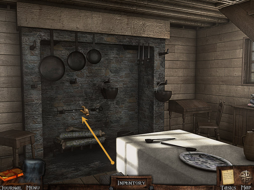 Go back to the farm, and go inside to where the fire is burning. Use the bucket of water to extinguish it. You can now collect the toasting fork on the back of the wall.