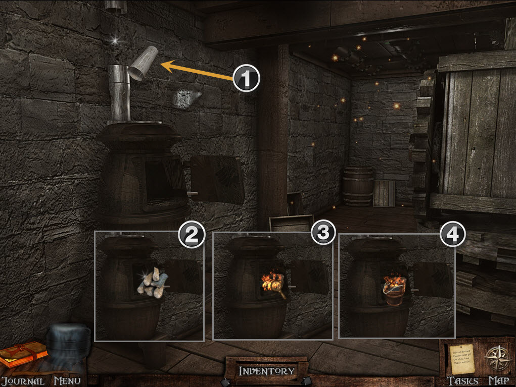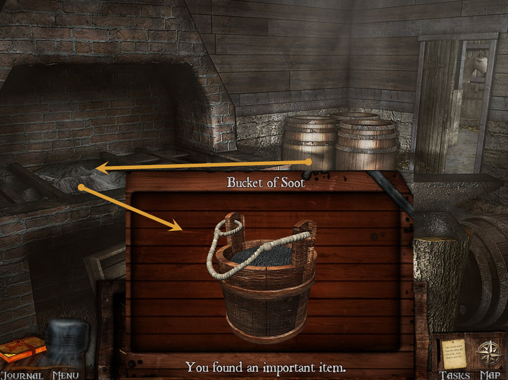 Go to the saw mill (to the left). Go down to the basement. Use your stovepipe, matches, firewood & bucket of soot.