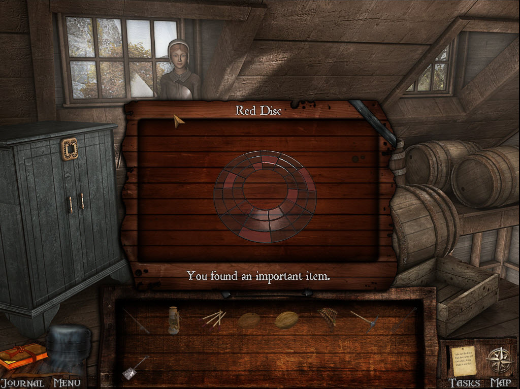 Go upstairs to see the girl. She will be grateful and give you a red disc. She will follow you out.