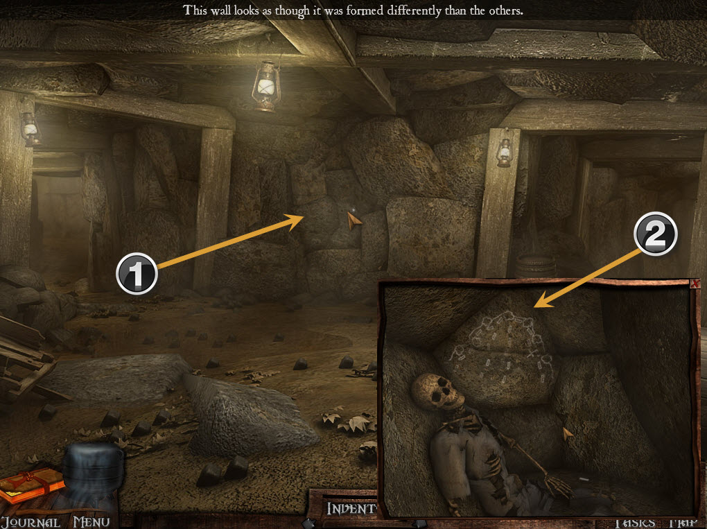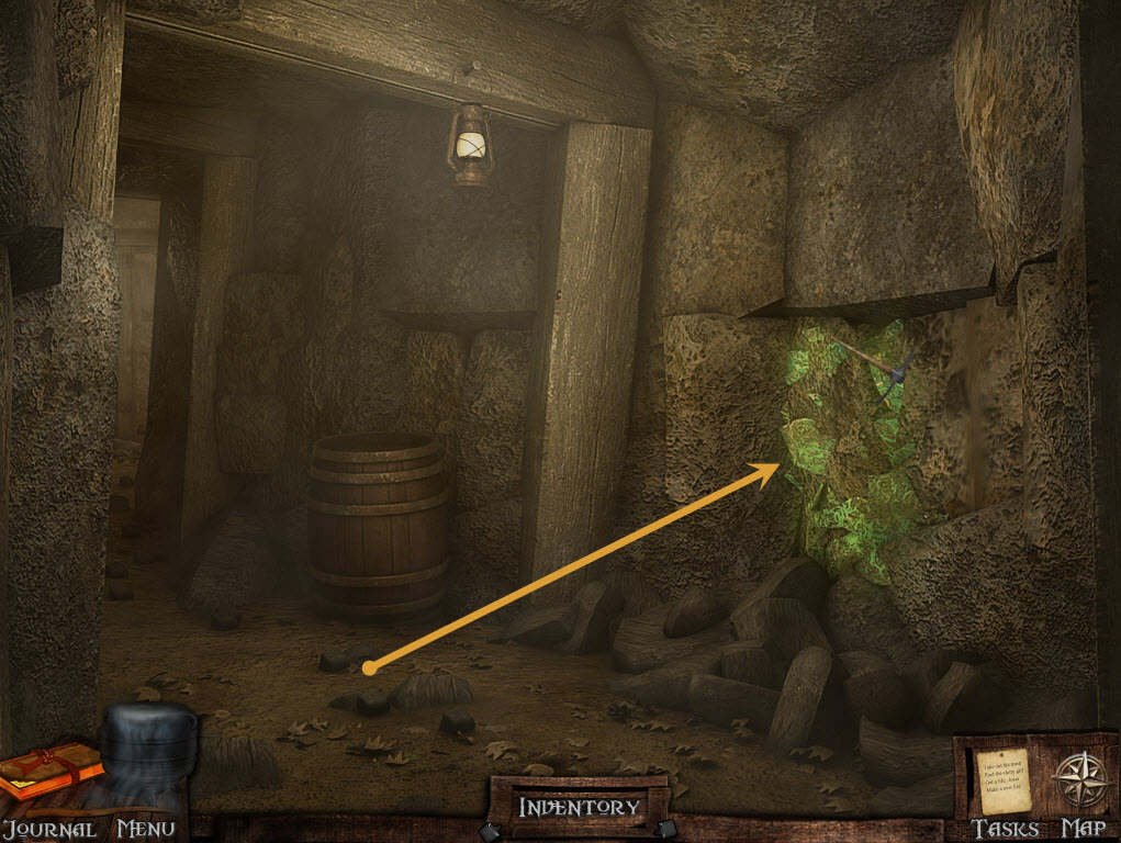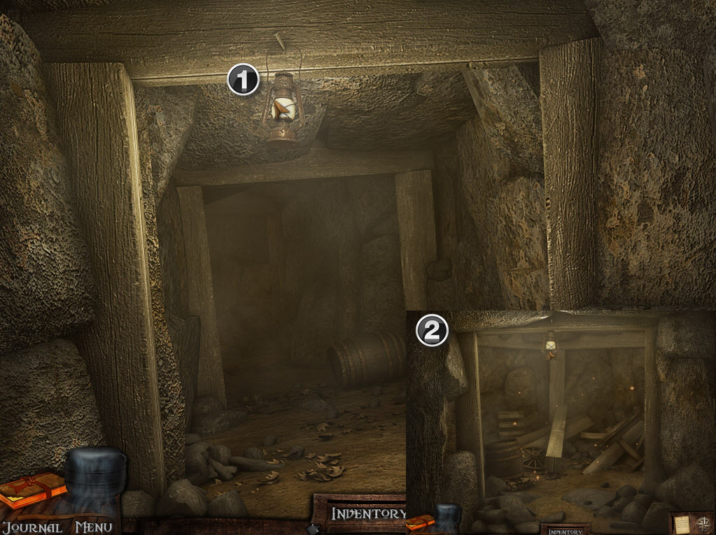 Go back to the mine entrance and go right – hang the lantern and use the matches to light it (1).
