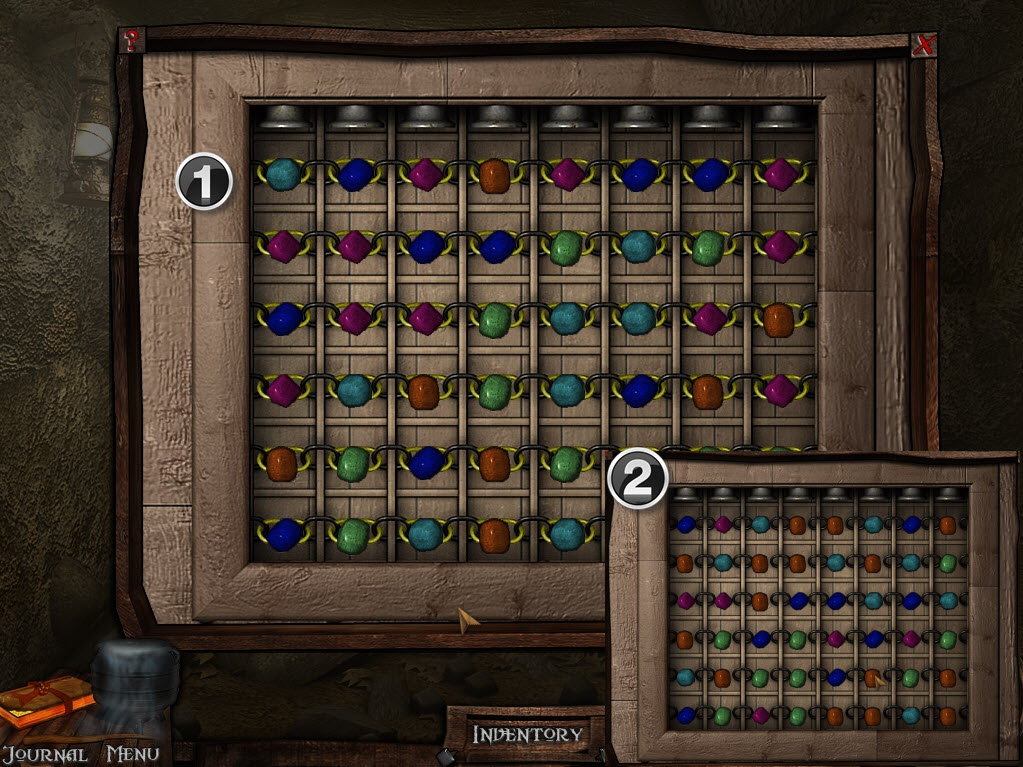Go forward until you reach a door. Put the minerals on the door to trigger a puzzle. All the links will start out as gold (1). Match three beads of the same color up or down to remove the gold links. Once all the gold links are gone (2), the door will open.