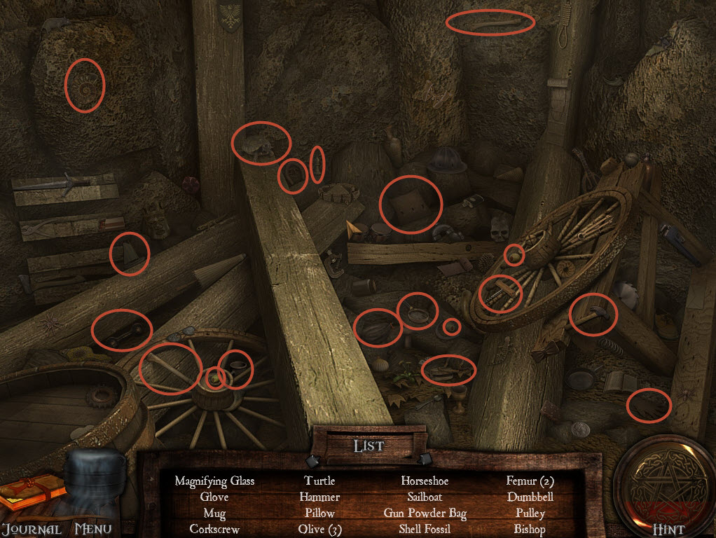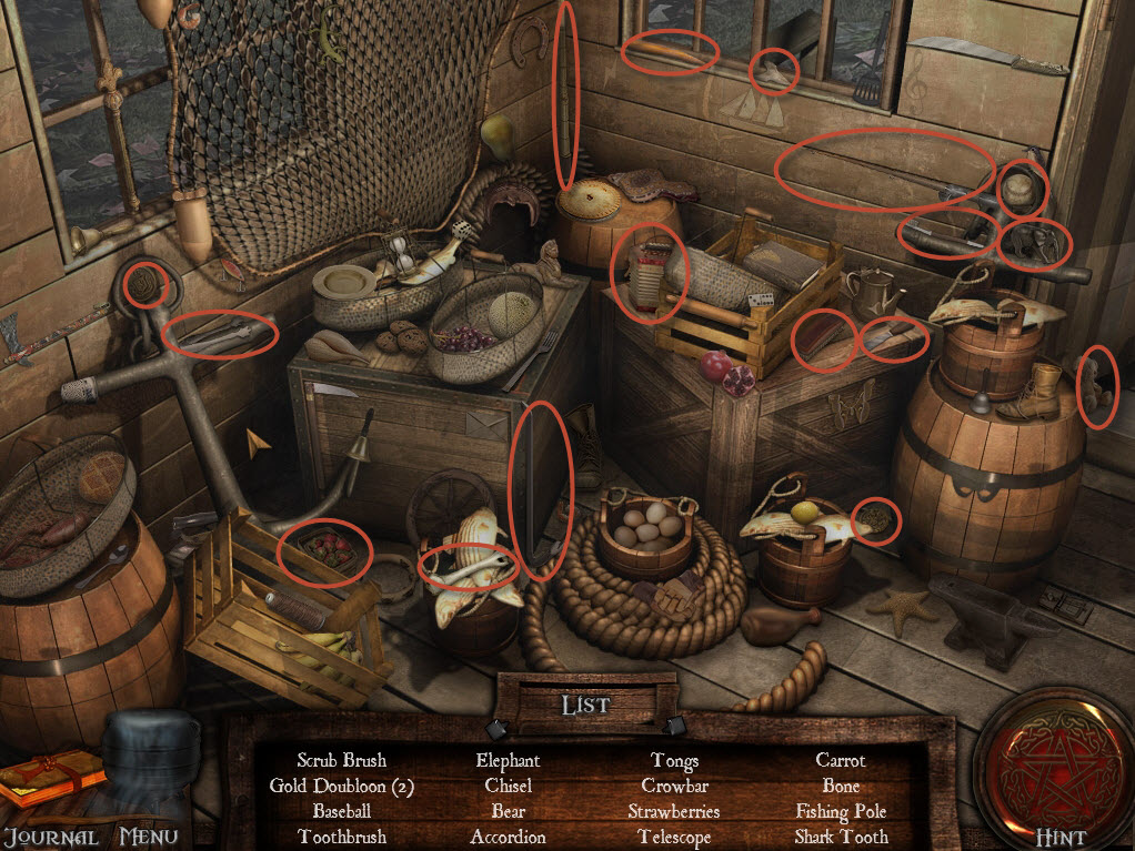 Go right to the fishing hut and solve the hidden object puzzle to retrieve the fishing pole.