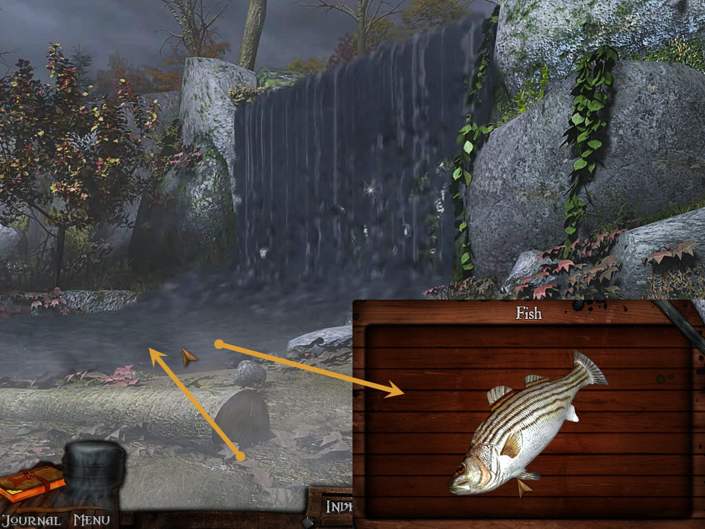 Use your fishing pole to the left of the waterfall and catch the fish.