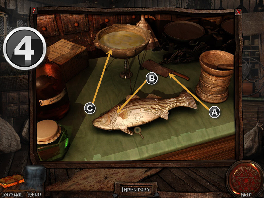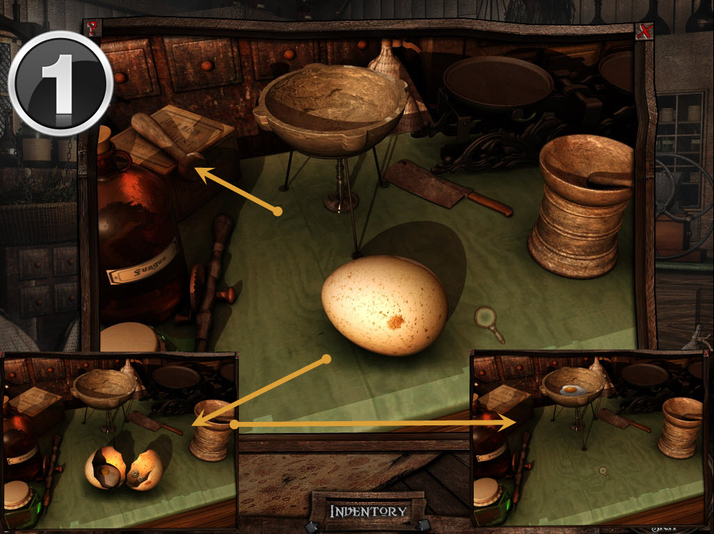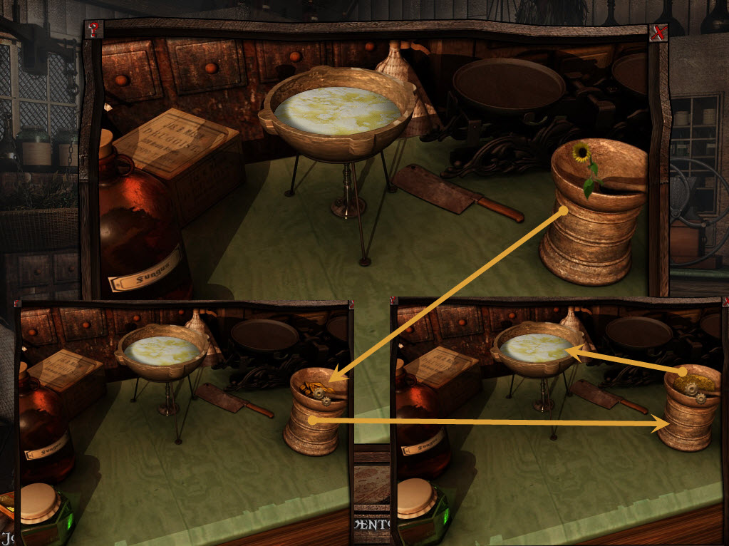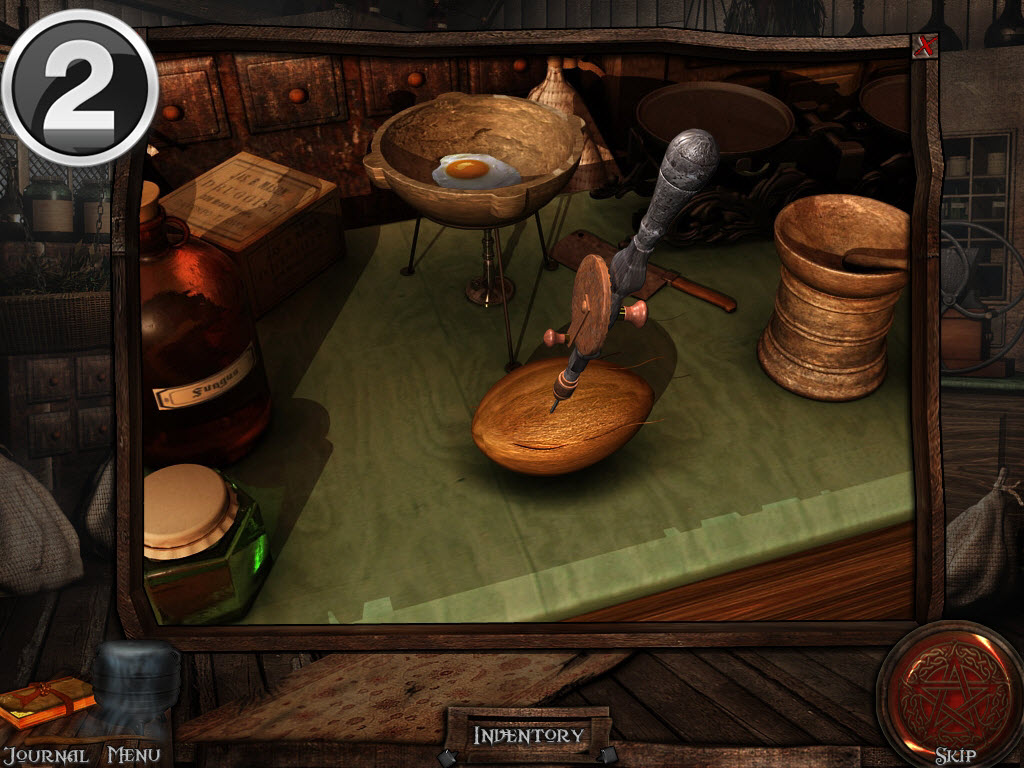 Go inside, and to your left will be a puzzle. Crack the egg with the bat on your left. (1) Place the coconut on the table and use the drill to grind a hole in the coconut for coconut milk. (2) Next, place the sunflower in the mortar and pestle, and grind it. Click on it to add it to the bowl. Lastly, add the fish, and use the cleaver to chop the head off. Click on the fish to add the final ingredient. (4) Click on the bowl to retrieve the calming potion.