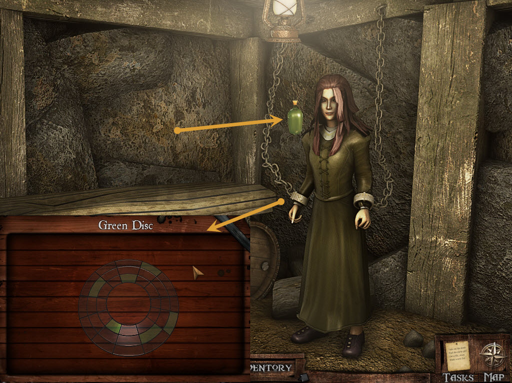 Give her the calming potion – she will be grateful and give you the green disc.