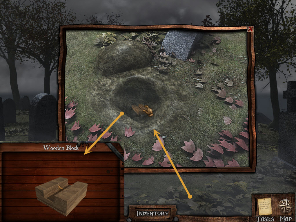 Use the magnifying glass to focus in on the area to the right, and use your shovel to dig up the wooden block.