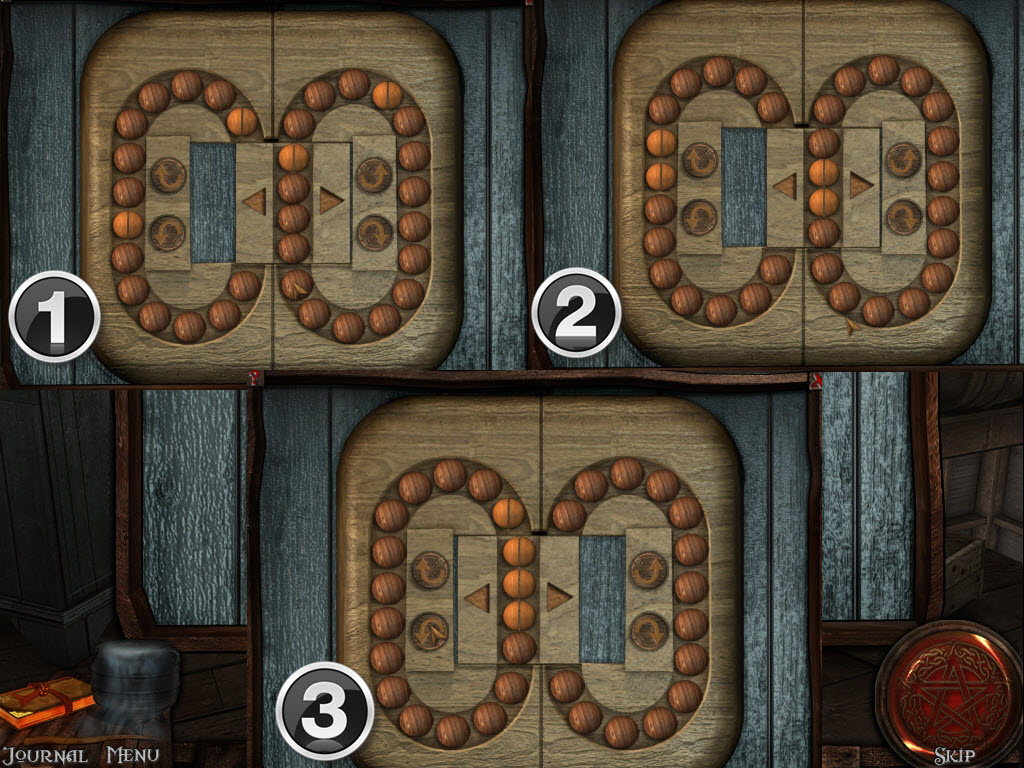 Once you use the wooden block to open the chest, a puzzle will begin. Solve by shifting the middle piece (1) to group the lighter beads in groups of two (2). Then group all four beads together and move to the middle to solve. (3) Retrieve the bamboo