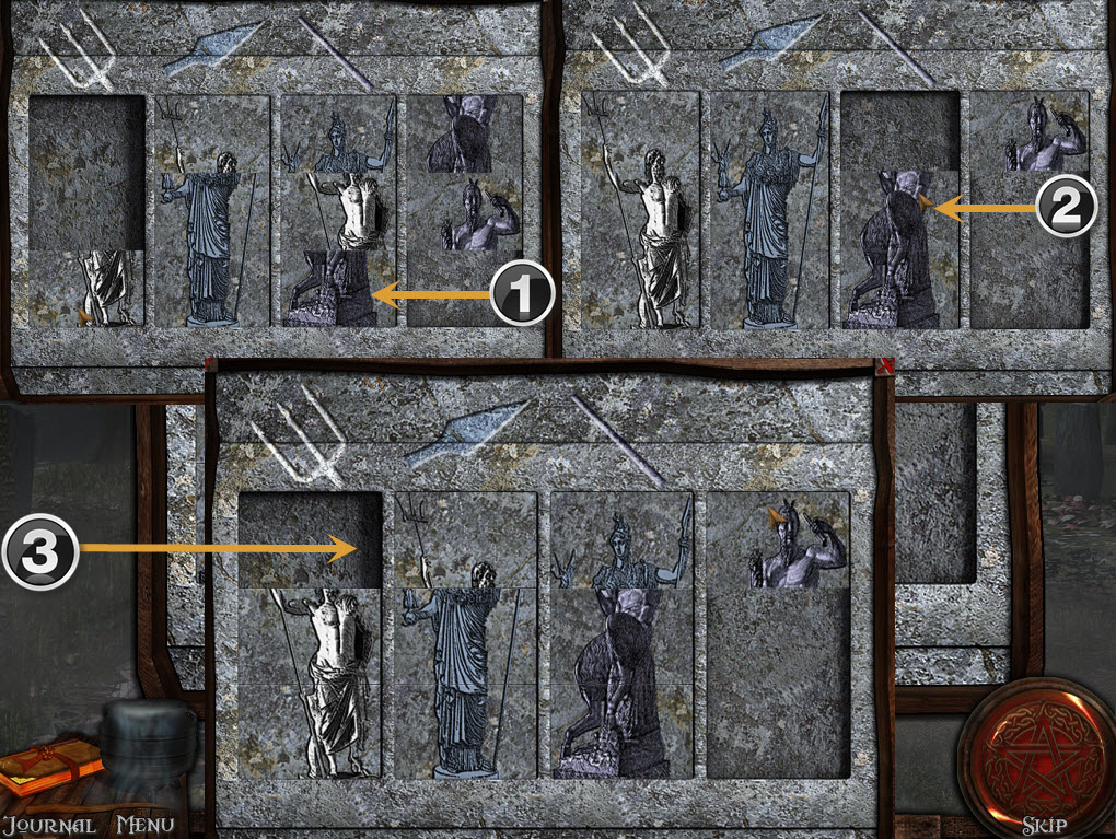 Go back to the North gate and left toward the docks – go right past the fishing hut over the bridge to the statue of pan. Give the bamboo flute to Pan and a mini puzzle will start. [Solve the bottom row first (1), then the middle (2), then the top (3) to retrieve the wooden gear]