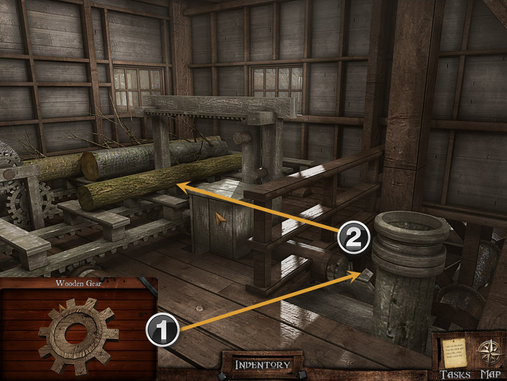 Go to the North gate and then left to the Sawmill. Enter the Sawmill and go to the rear of the room where the machinery is.