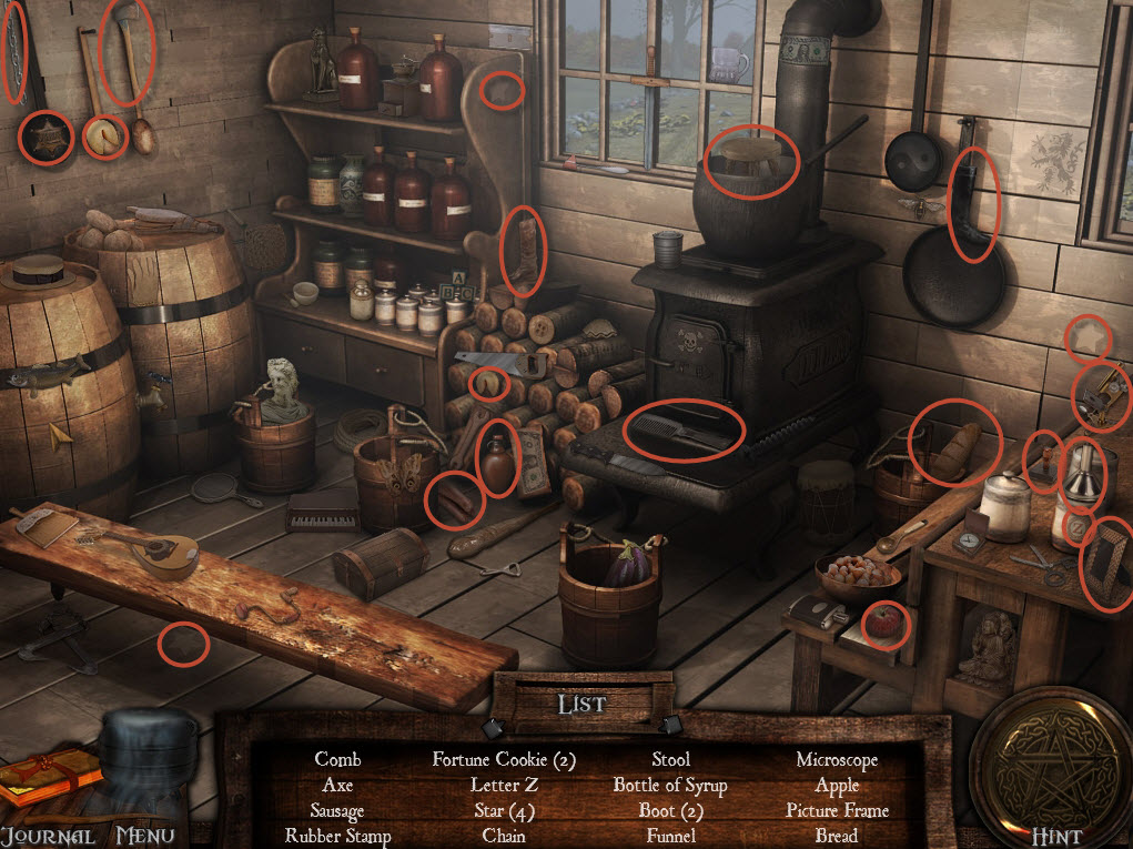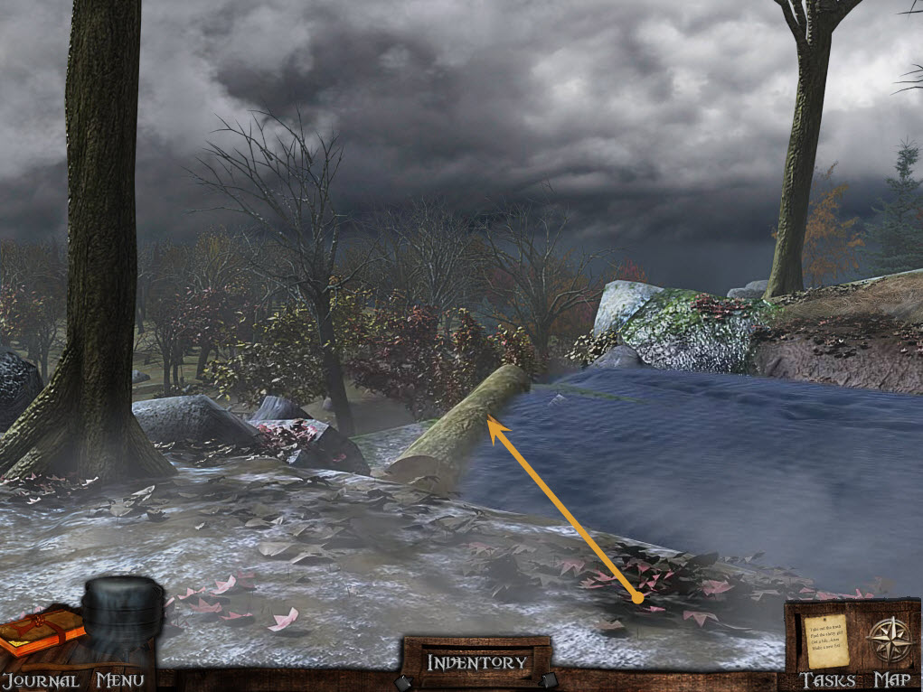 Solve the hidden object puzzle to retrieve the maple syrup. Go back to the Town Crossroads and left to the waterfall.