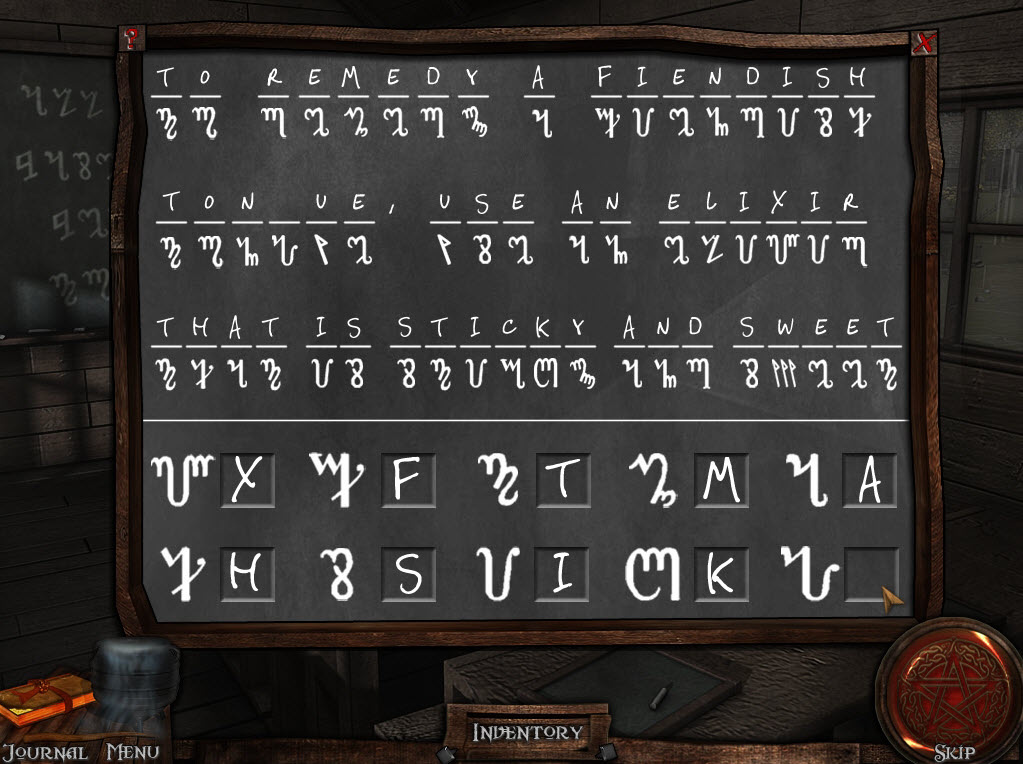 Once inside, click on the chalkboard to solve the puzzle. Select the letters at the bottom to change them (see journal). The answer is: