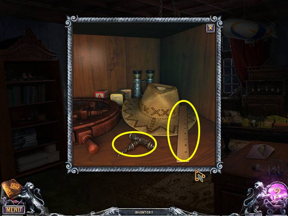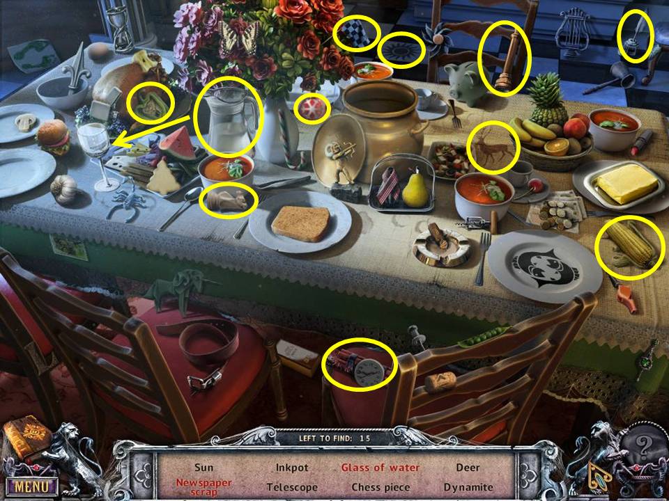 - Zoom into the pot on the table to get the acorn, bullet, and thimble.