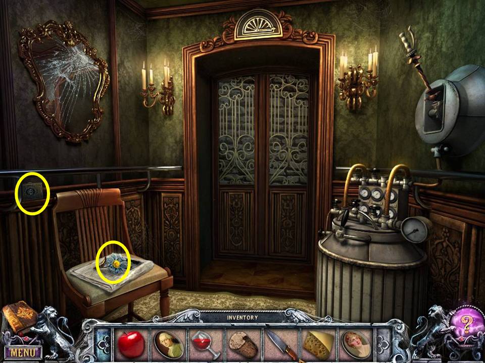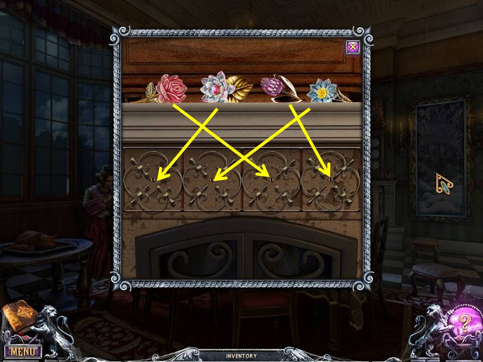 - Arrange the flowers as shown in the picture above the fireplace to open the secret compartment.