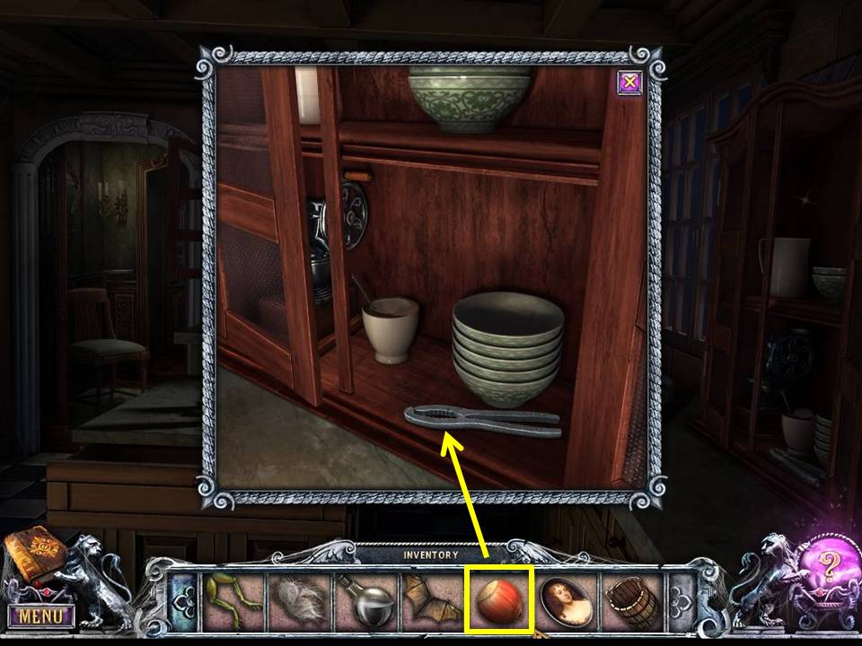 - Zoom into the cupboard on the left to get the kettle and portrait.