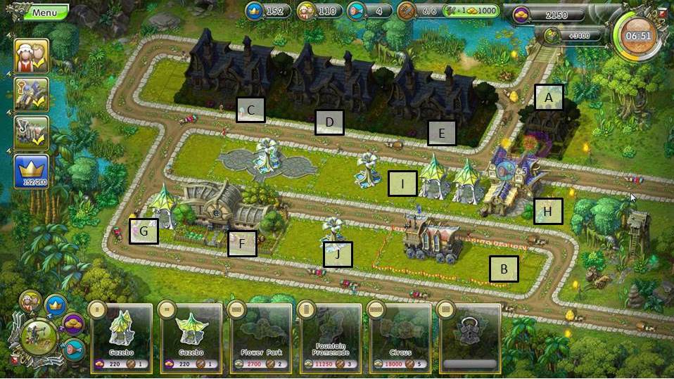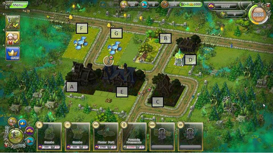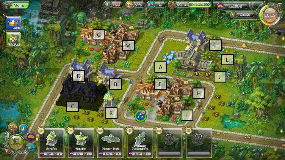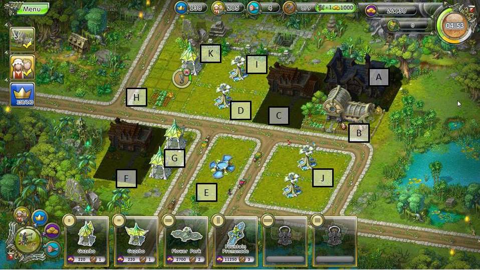 - Build 4 flower parks and 1 gazebo (D I J K)