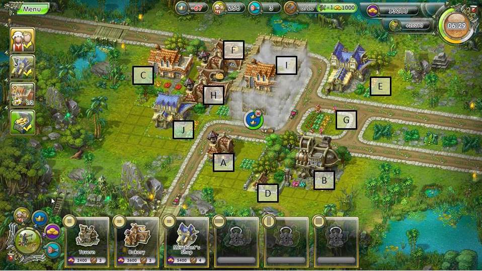 - Build a bakery and upgrade food to level 3 and luxury to level 3 (bottom right lot I)