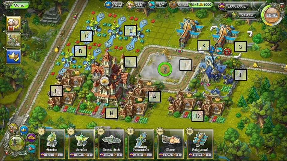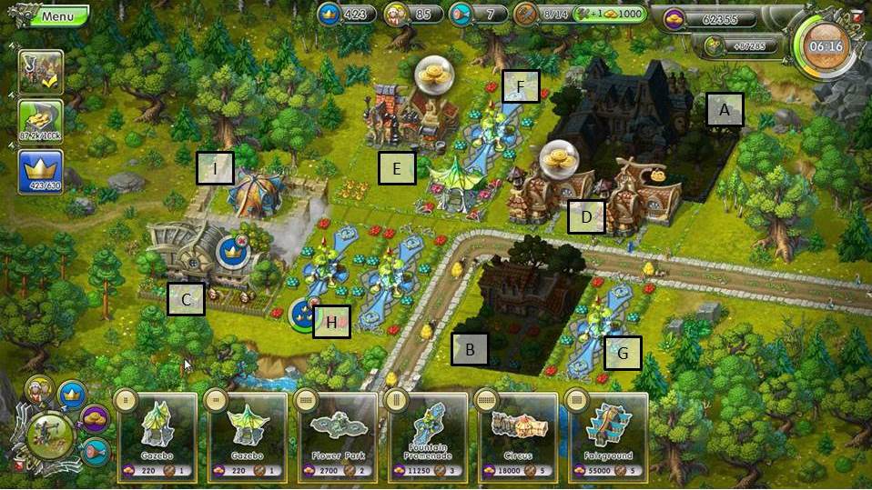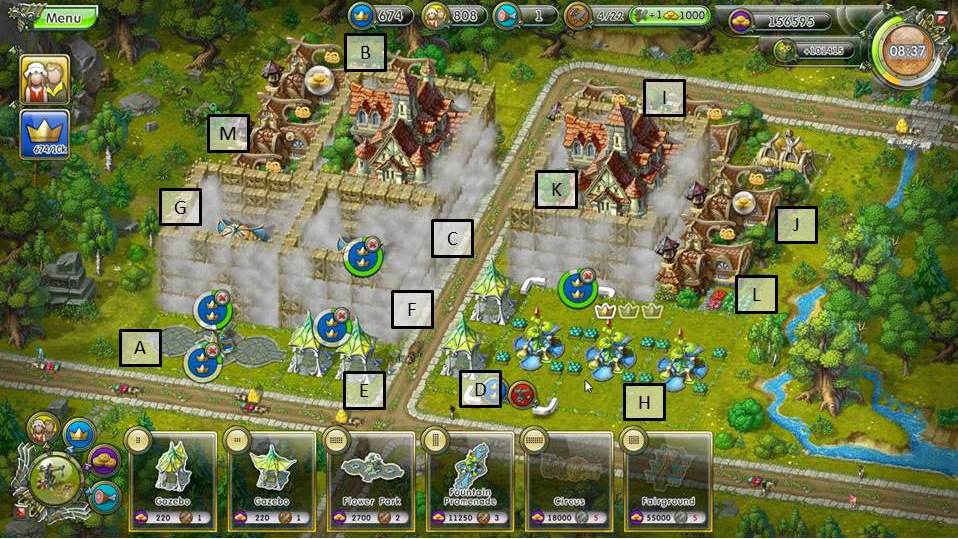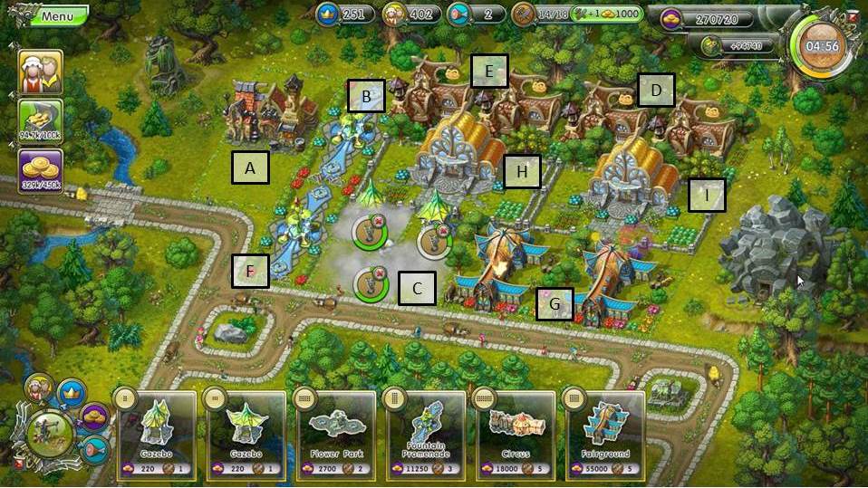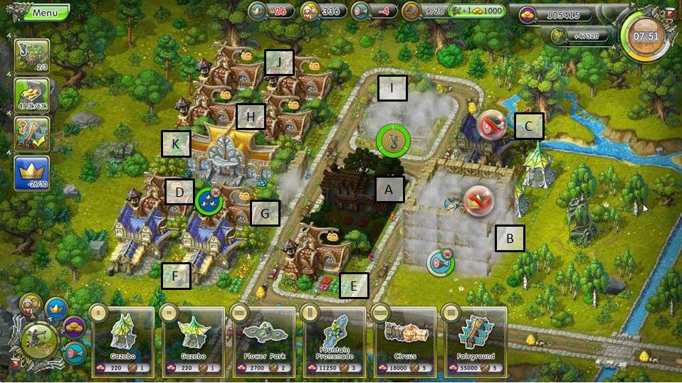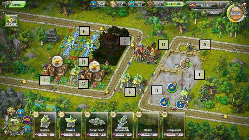 - Build 2 fairgrounds (F G), 4 gazebos (D E) and 3 fountain promenades (D H)