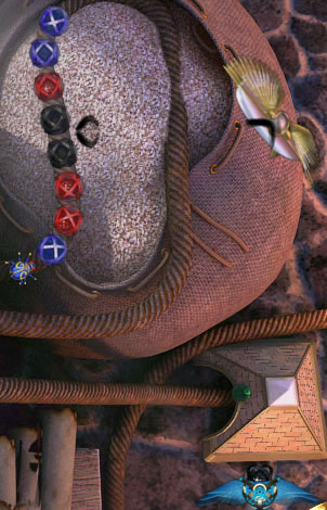 In the above screen it is possible to make 3 matches by hitting the black pair with a black sphere, then the red ones will collapse together and finally the blue ones will collapse as well. These blue spheres would constitute your 3rd match and a power up would be thrown in the air right after the match is made. Your job is then to catch it if you wish to use it.