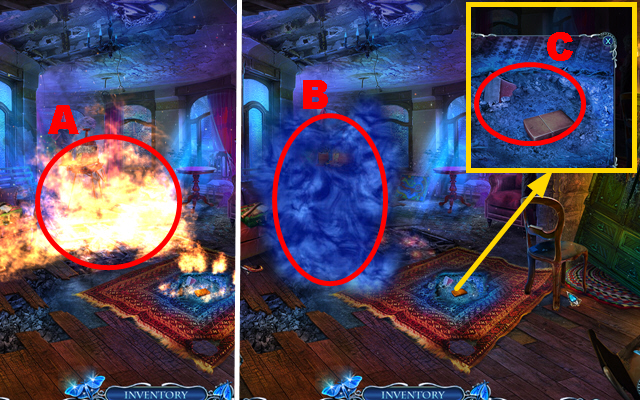 - Take the LIGHTER, use the BRUSH, and take the AXE HEAD (C).