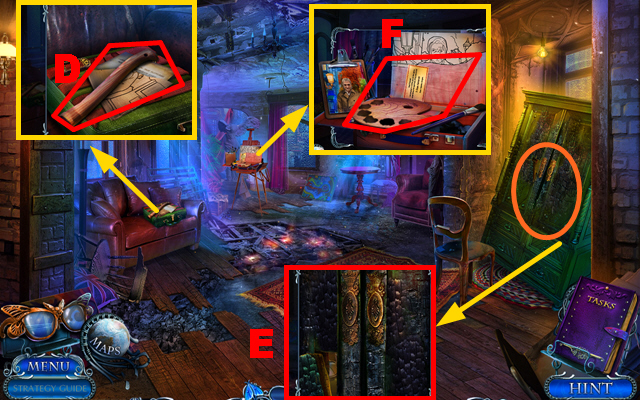 - Take MORGAN'S ADDRESS, place 2 PICTURE PARTS, and the PAINTS (F).