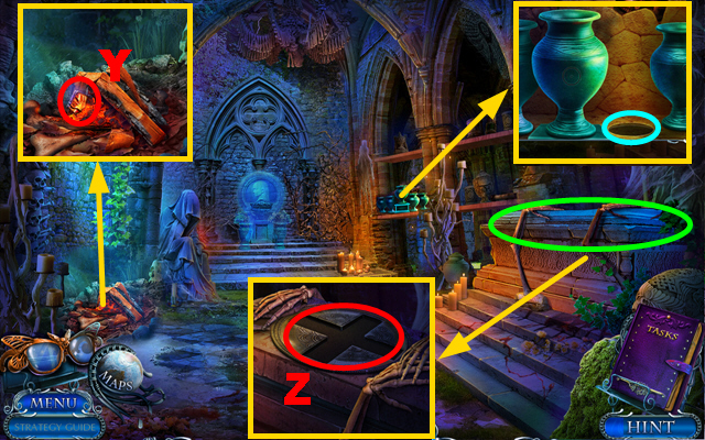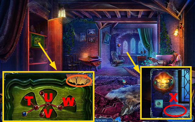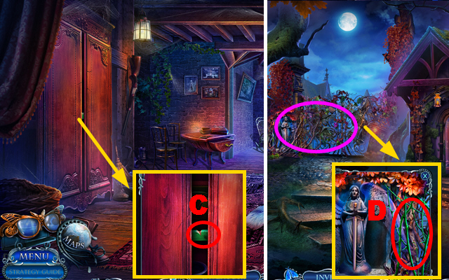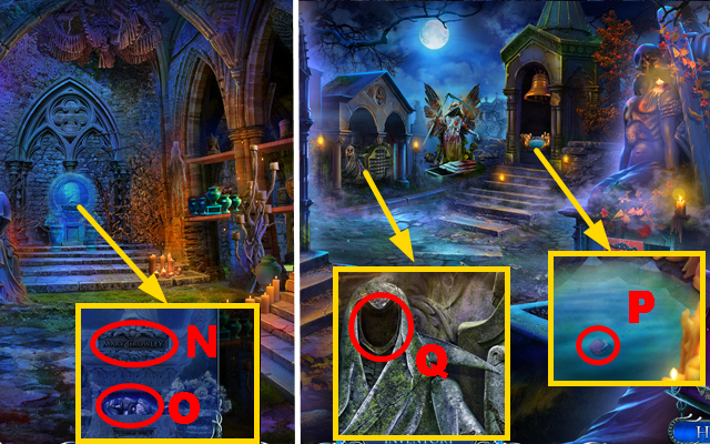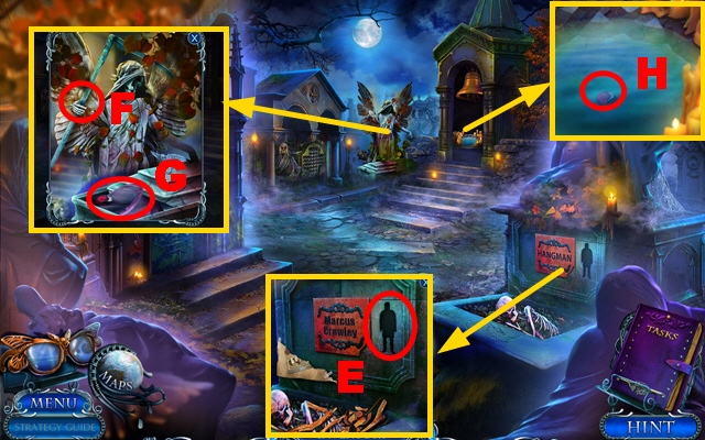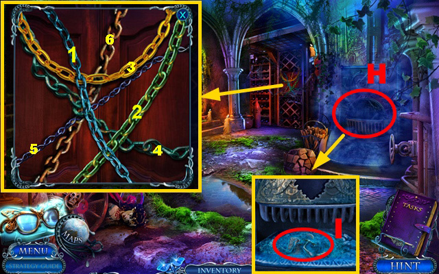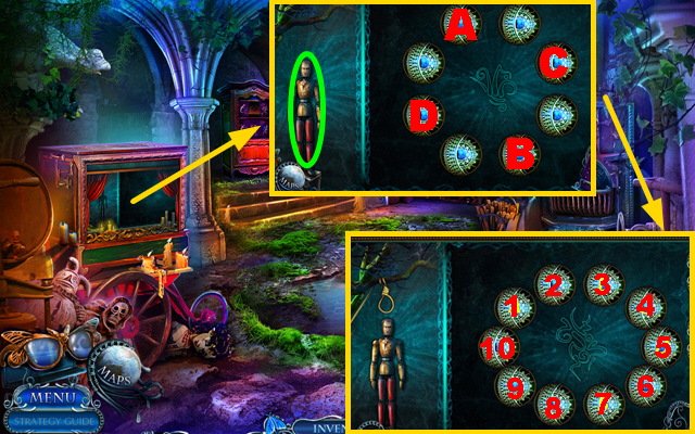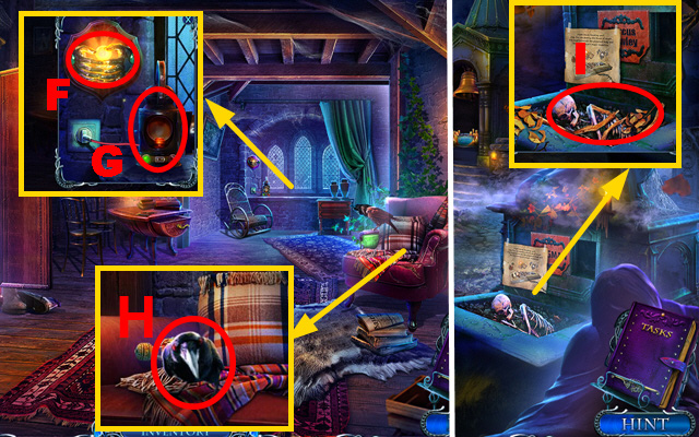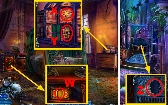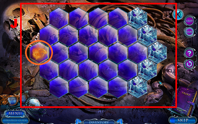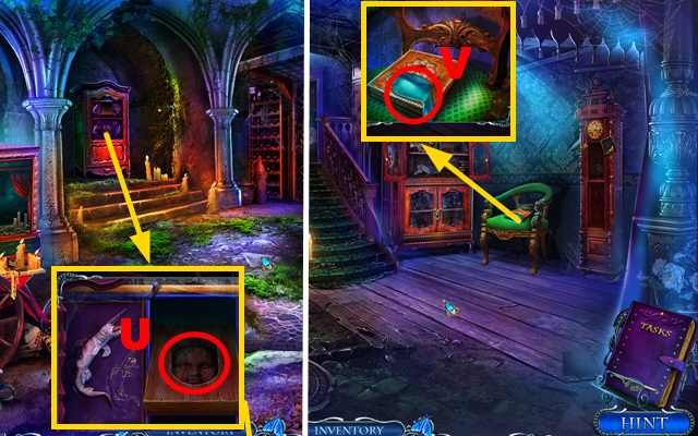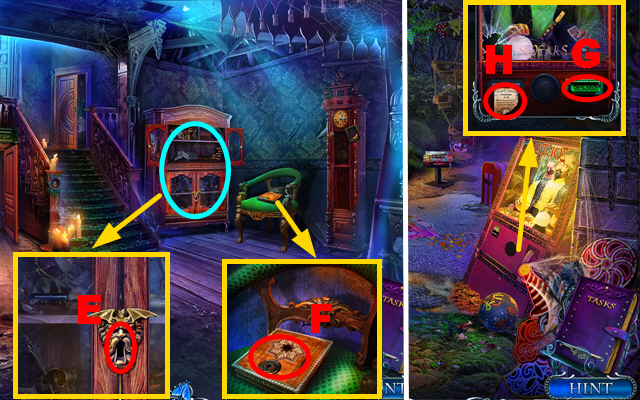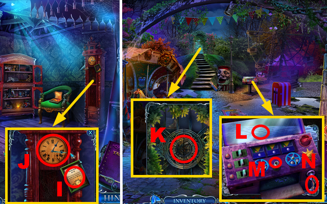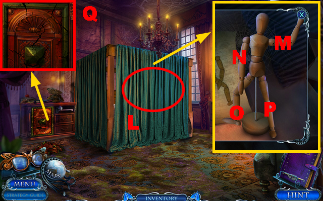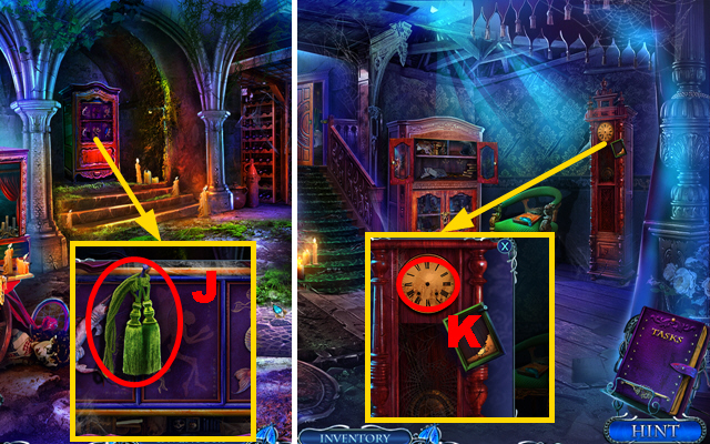 - Take the CURTAIN TIES, place the CREATURE INLAY, and take the CLOCK HANDS (J).