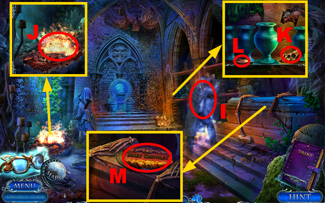 - Use the FAN, take BROKEN SKULL 2/2 (K), and the LOCK CLUE (L).
