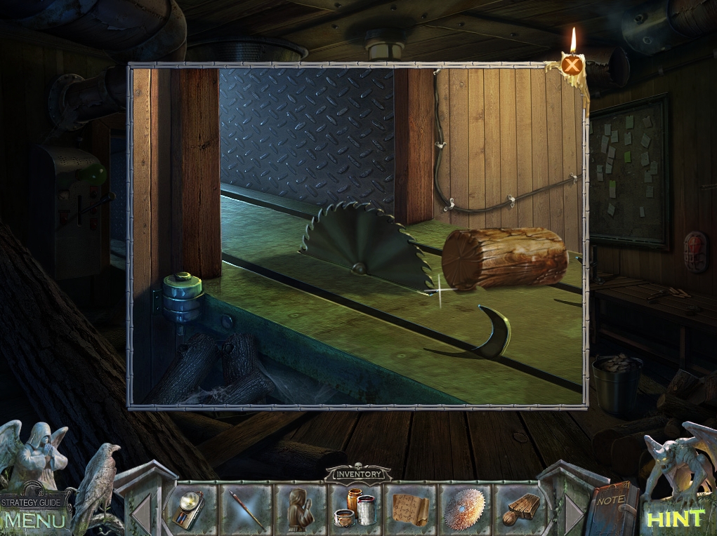 - Zoom into the circular saw table, saw the piece of wood, and take the WOODEN STATUETTE.