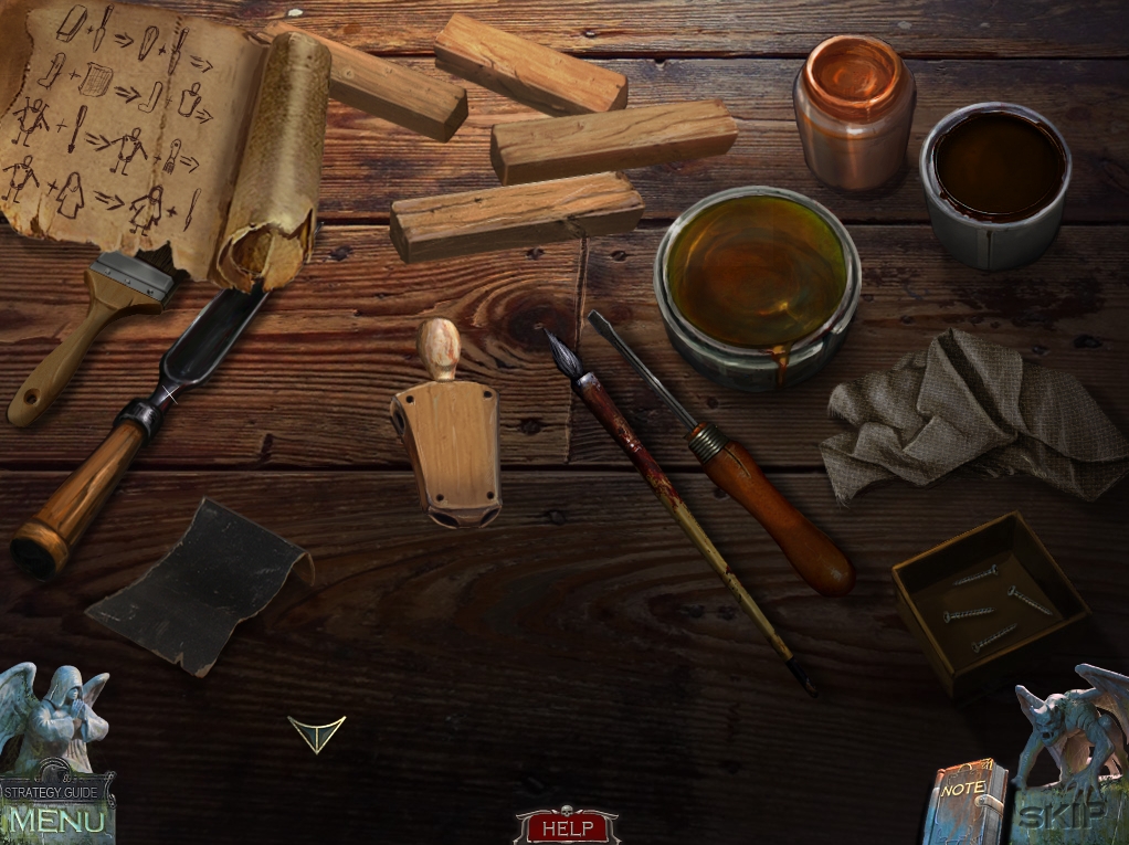 - Place the WOODEN STATUETTE, the DESIGN, the PAINTS, and the BRUSH on the table to initiate a puzzle.