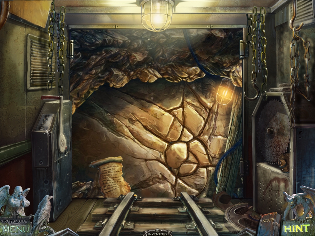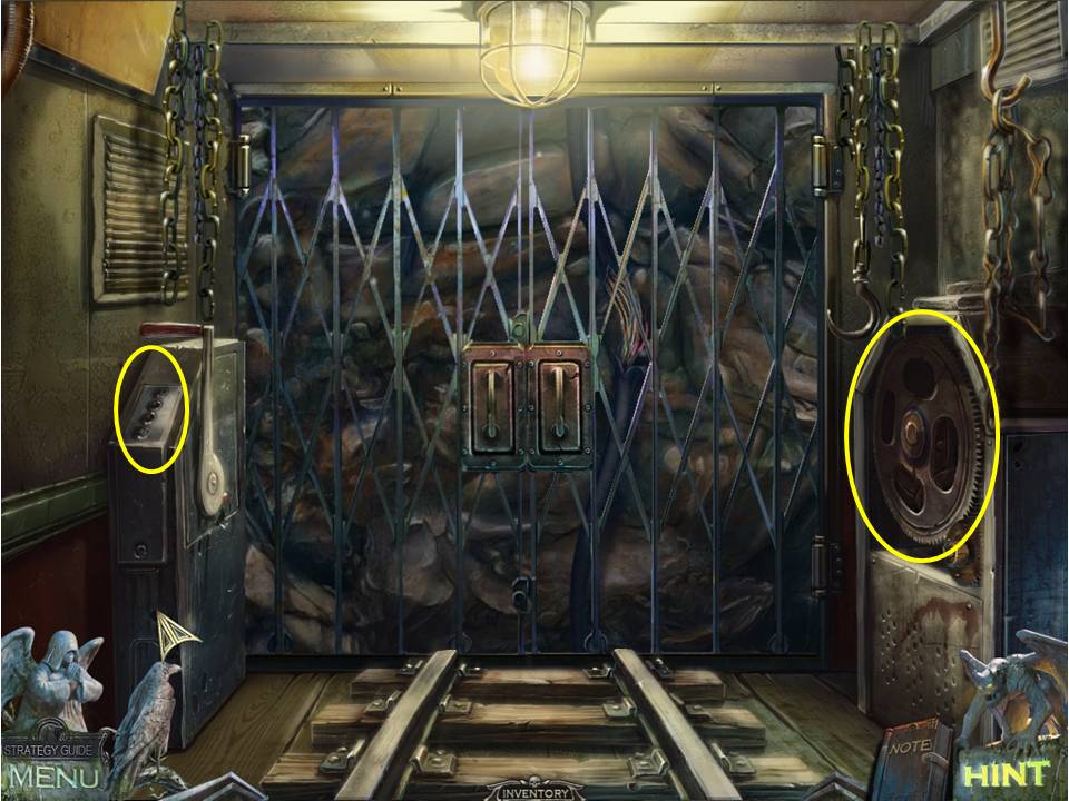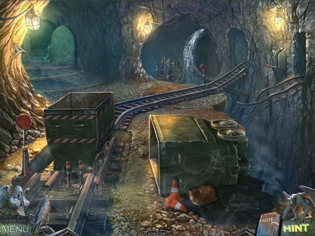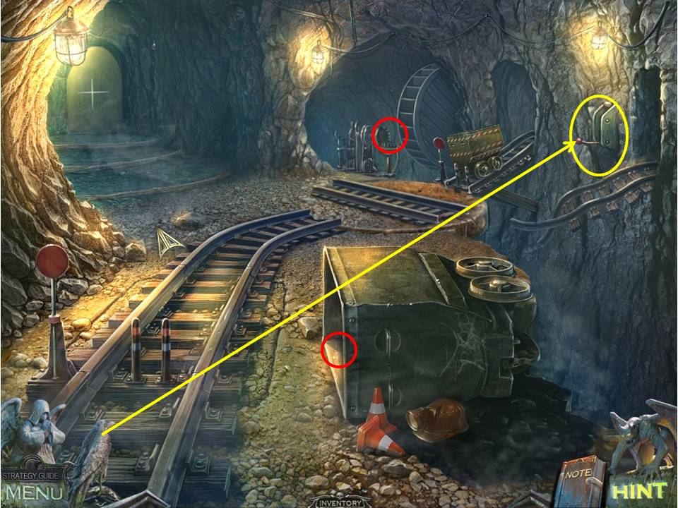 - Use the crow on the lever on the wall between the two arches at right to bring forward a mine car.