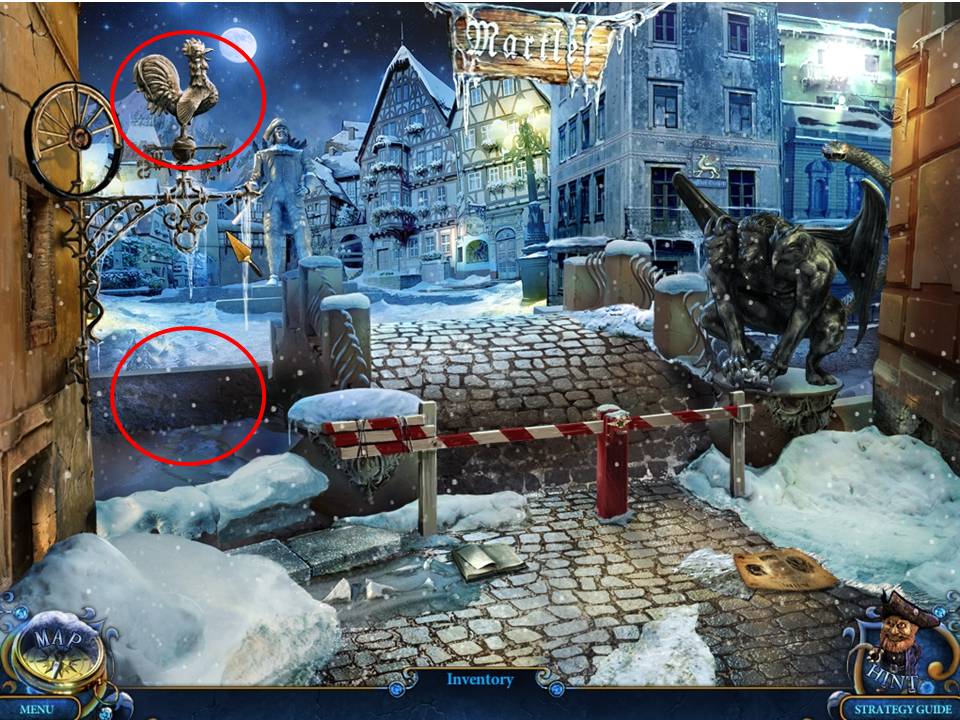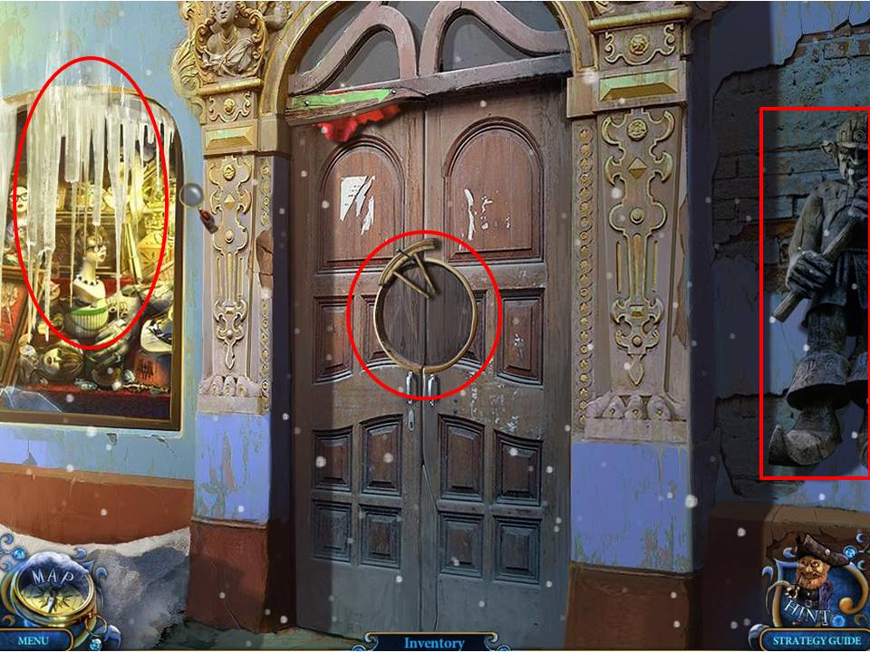 - Zoom into the window display on the left. Knock down the icicles with the CANE.