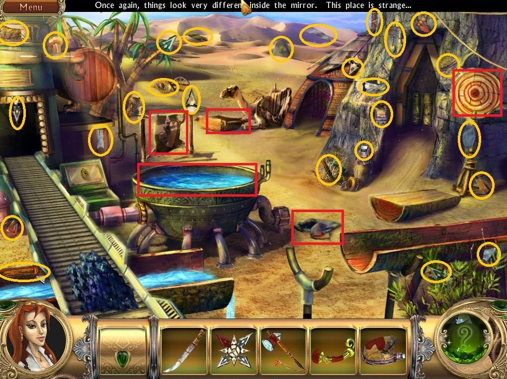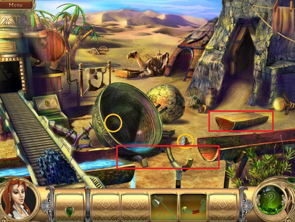 - Use the FULL WATERSKIN on the camel’s trough and get the hidden piece (move quickly – the camel will raise his head again obscuring the hidden piece. If that happens, fill the WATERSKIN again and refill the trough so he will drink).