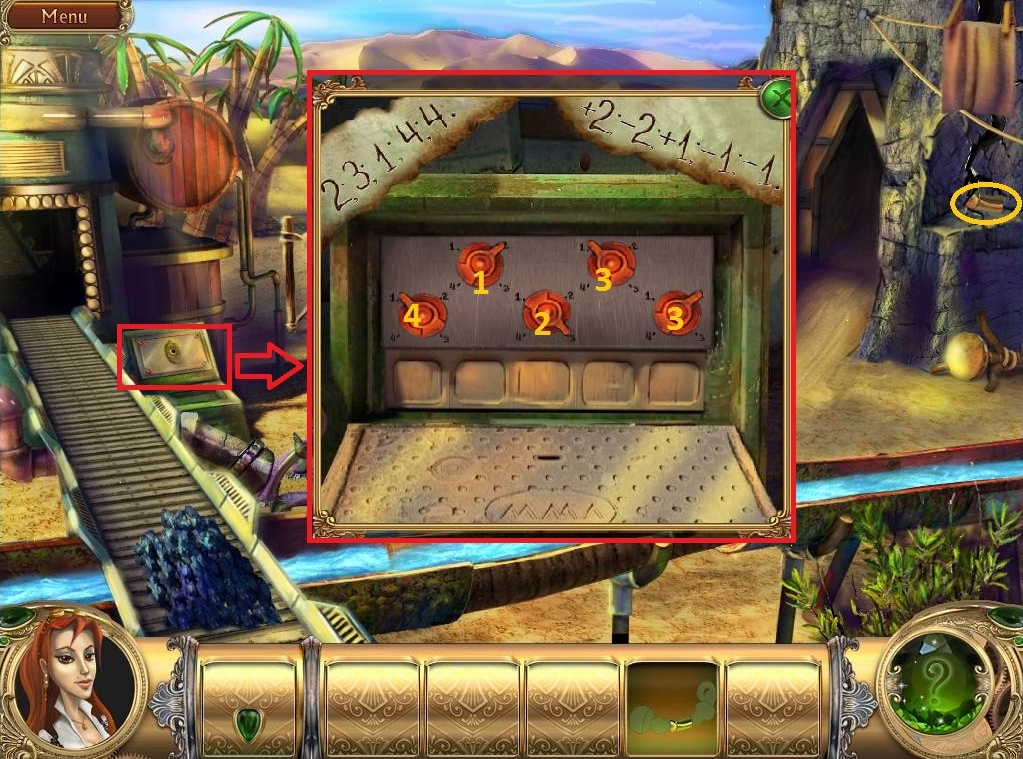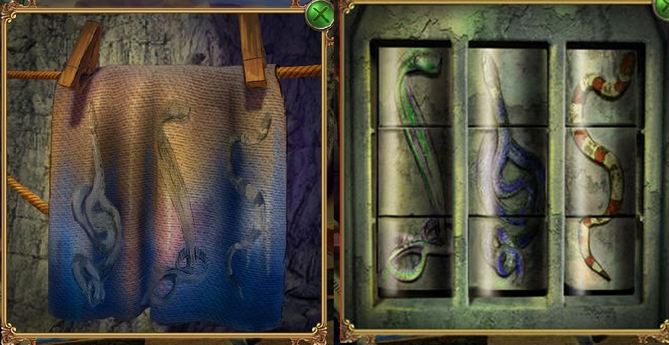 - Click on the doorway to the stone building and move the sections of the snake tiles till they match those on the rag.