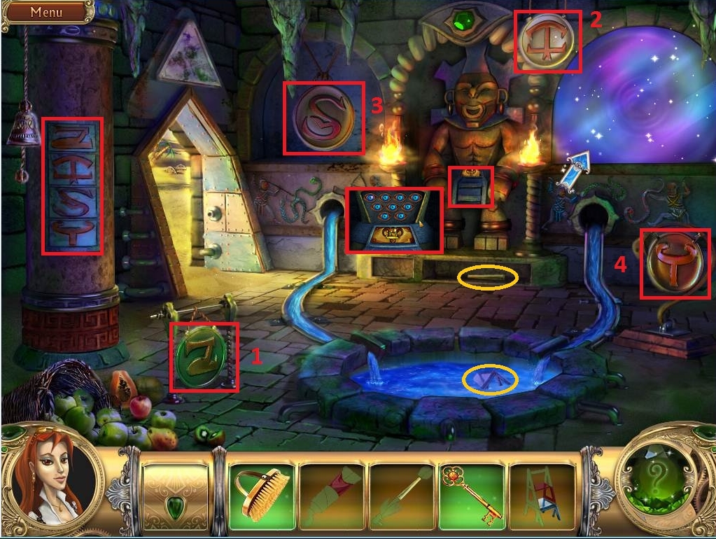 - Find the four gongs around the room and notice the symbols. You need to hit them quickly in the order in which they appear on the pillar to the left – labeled in order in the screenshot though order is random.