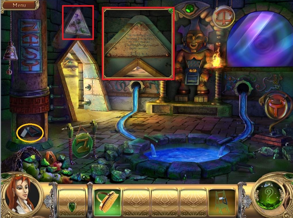 - Click on the statue and the GLUE on the left side and place the PART OF THE LOCK and the KEY to open the eye puzzle.