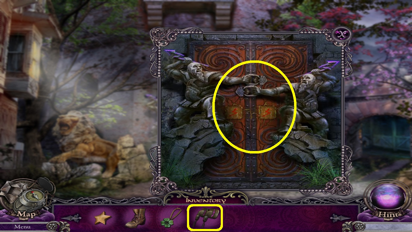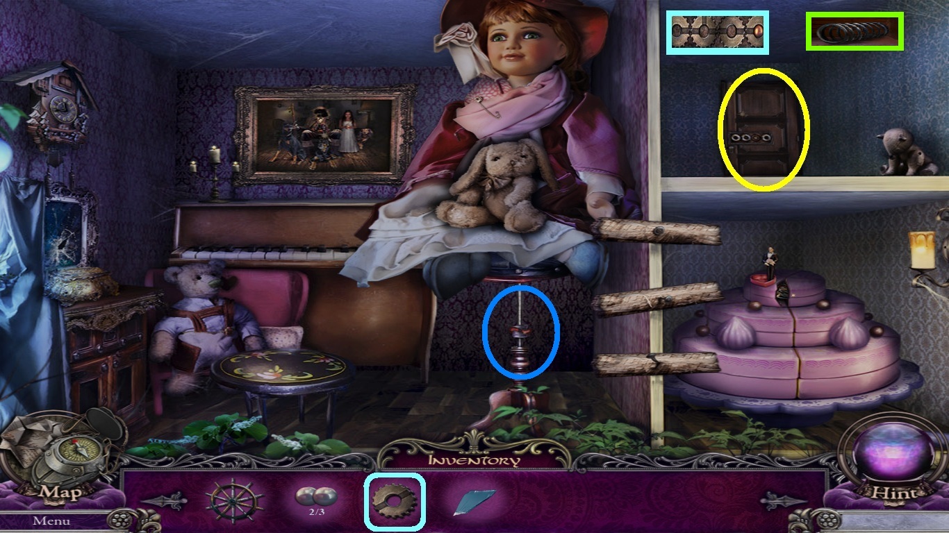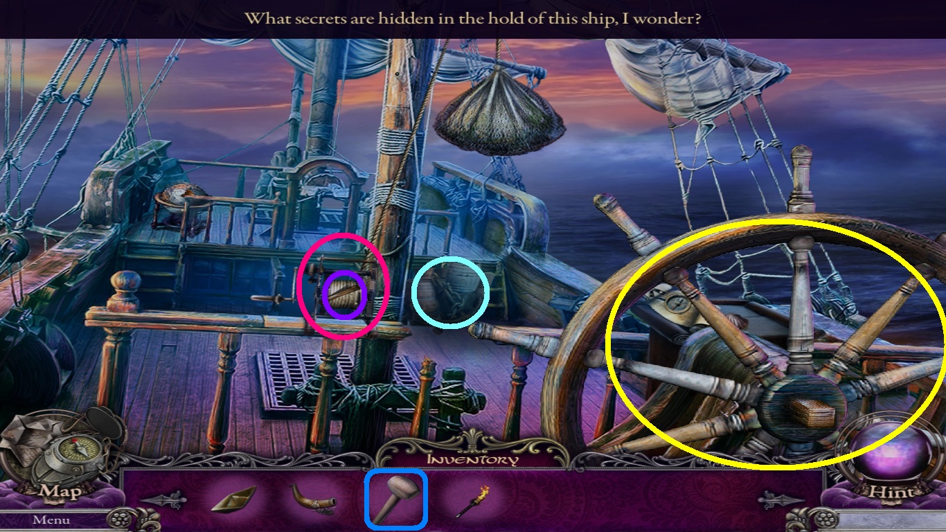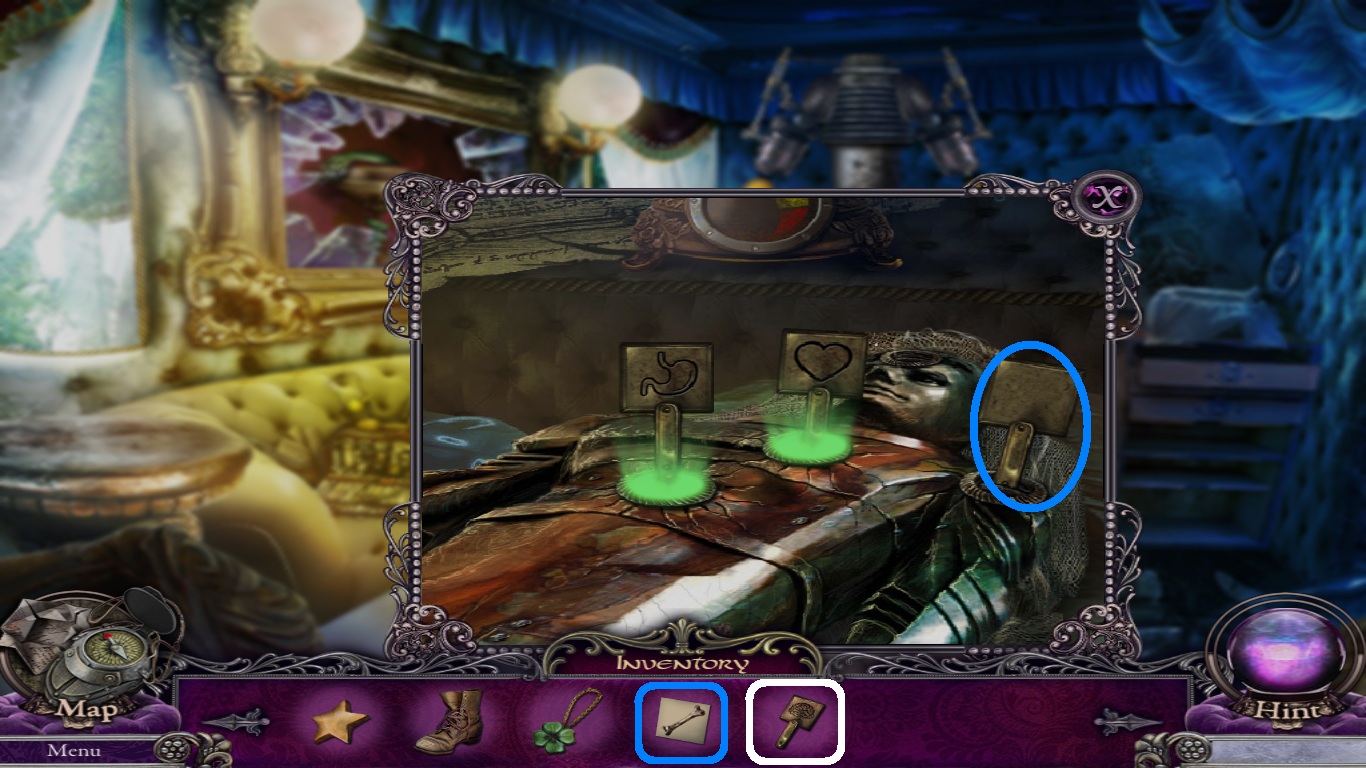 - Pick the hammer (blue square) from the inventory and place it on the wedge (purple circle).