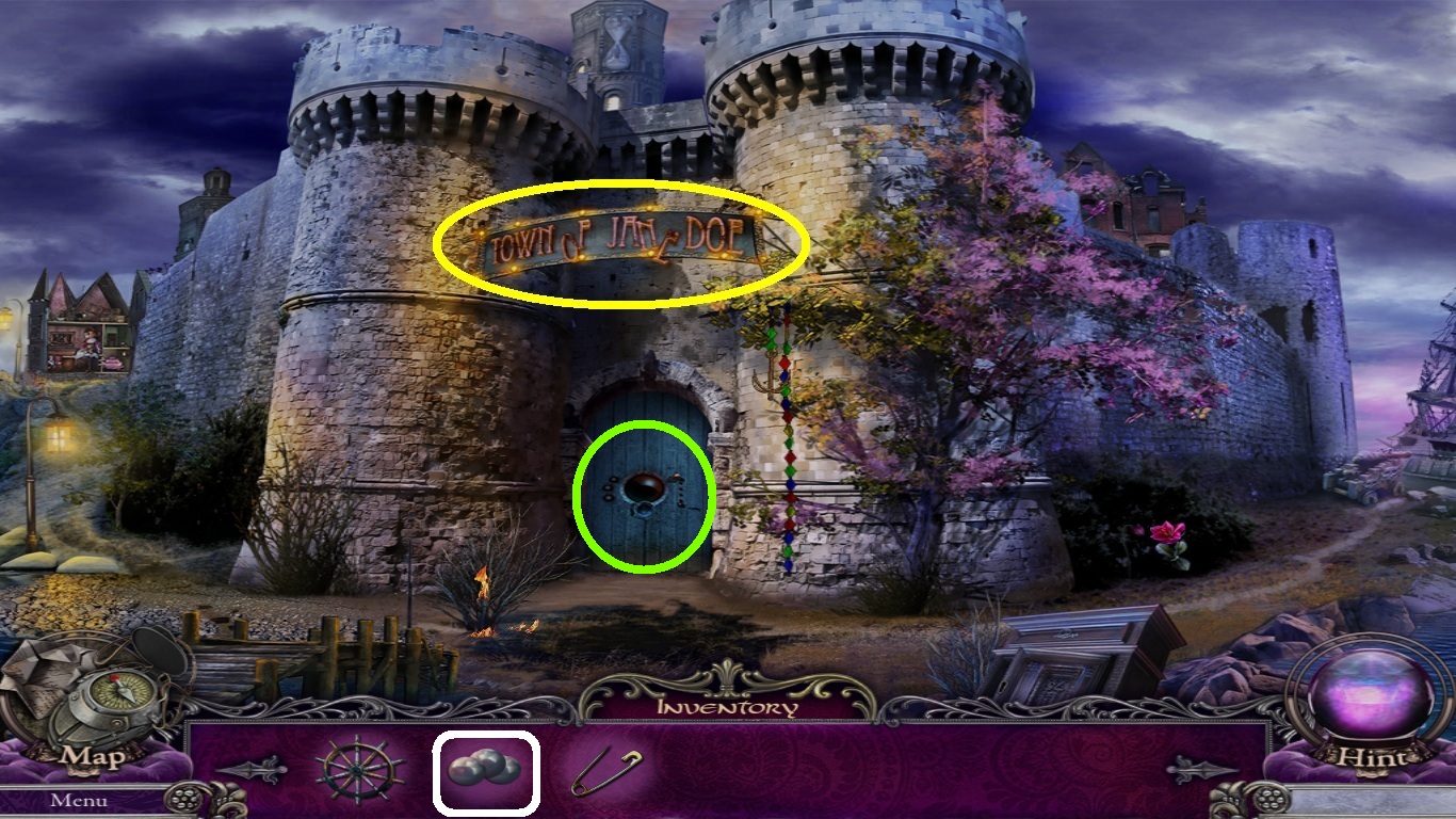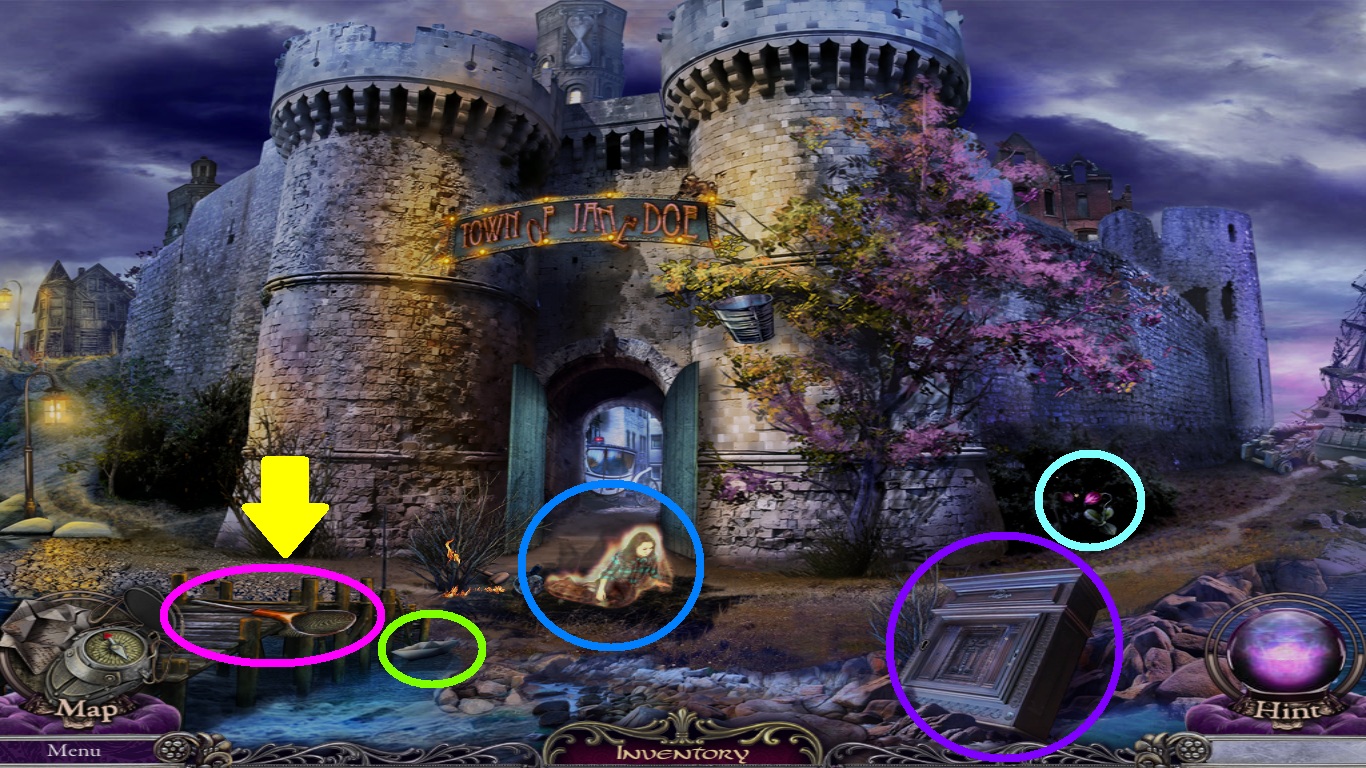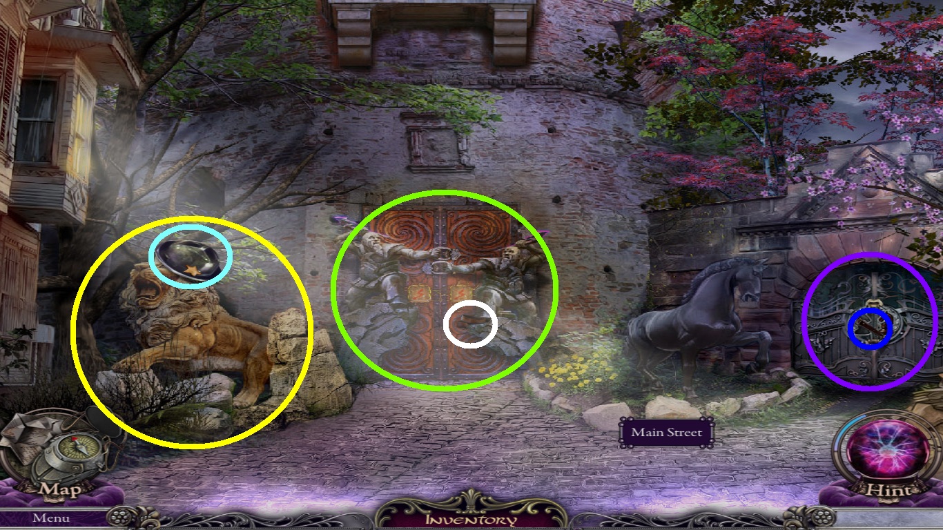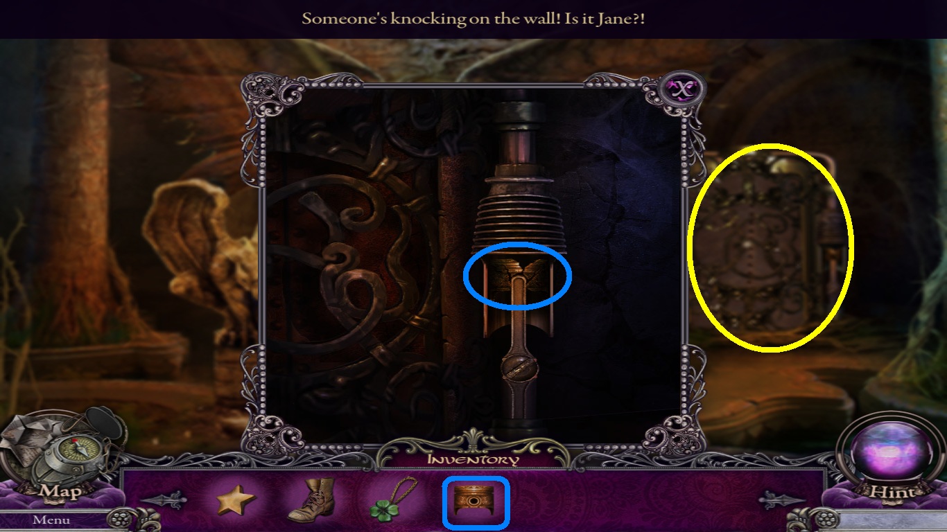 - Pick the hammer (blue square) from the inventory and place it on the wedge (purple circle).