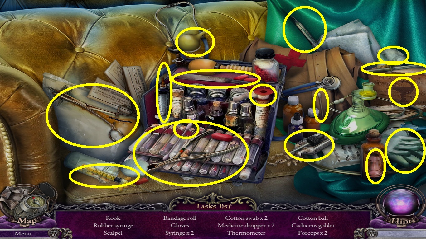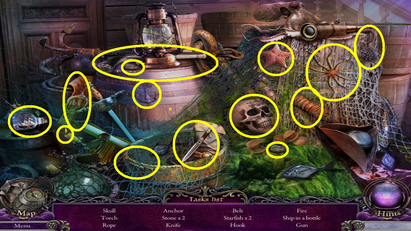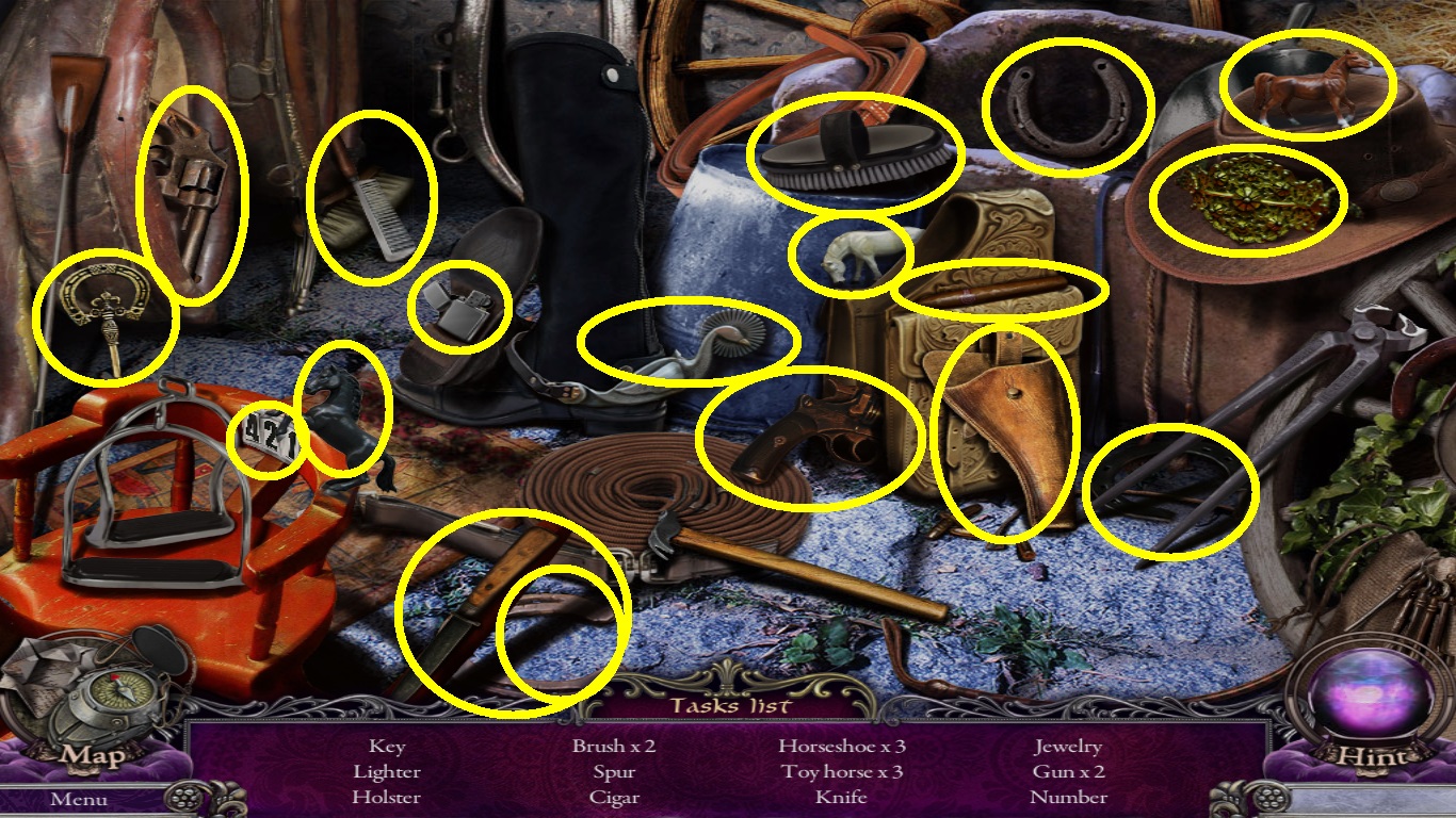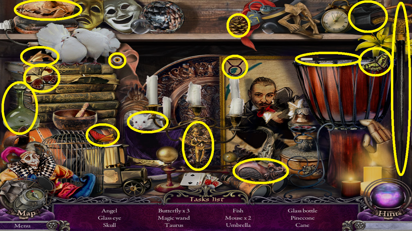- Find all the listed objects (yellow circles).