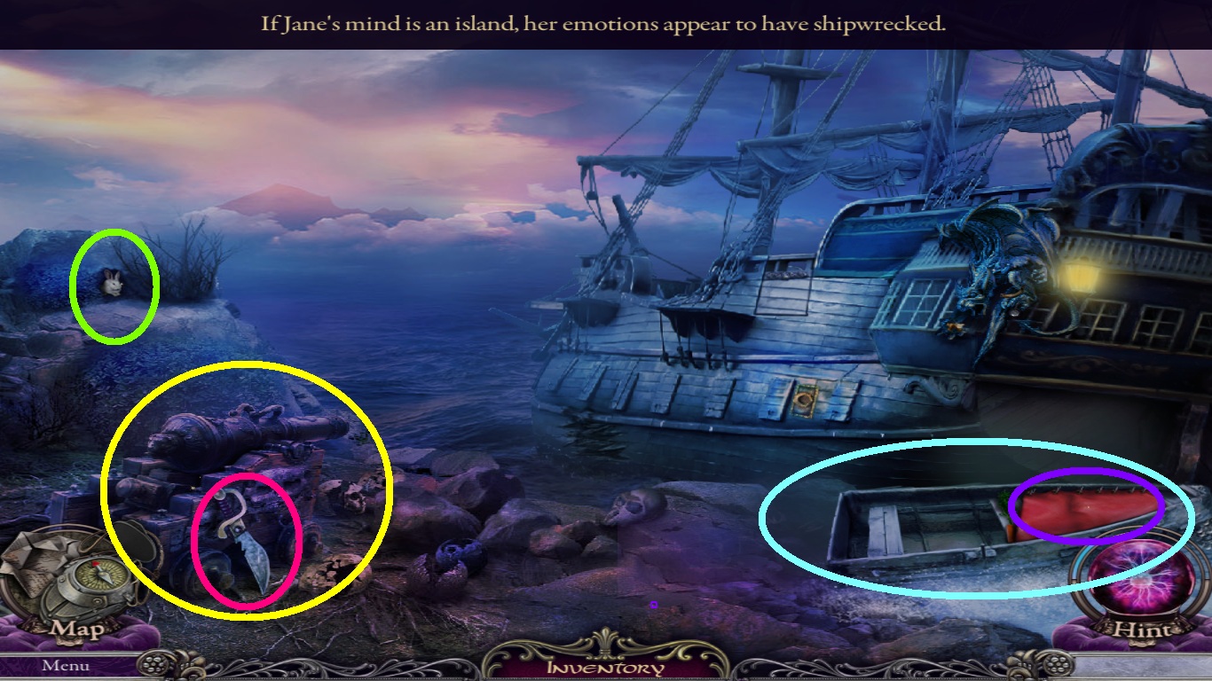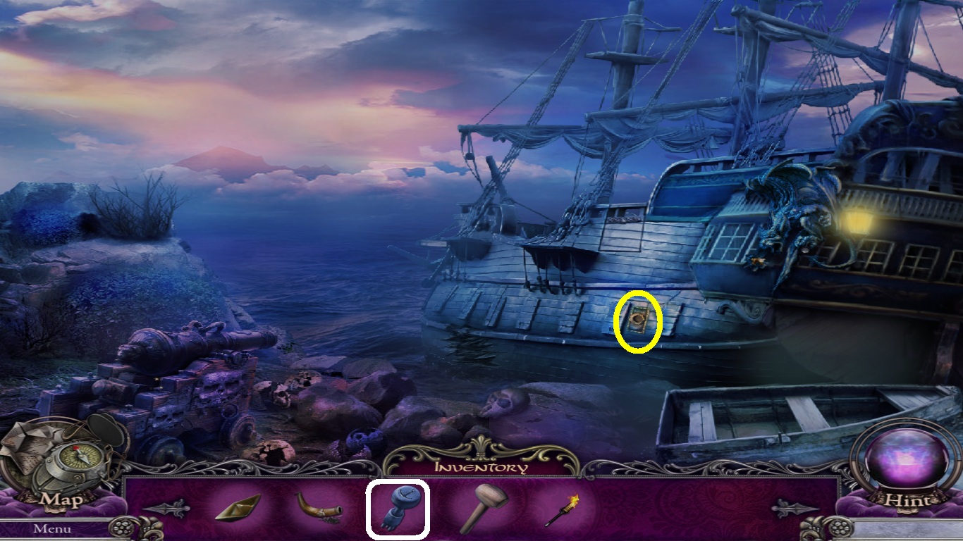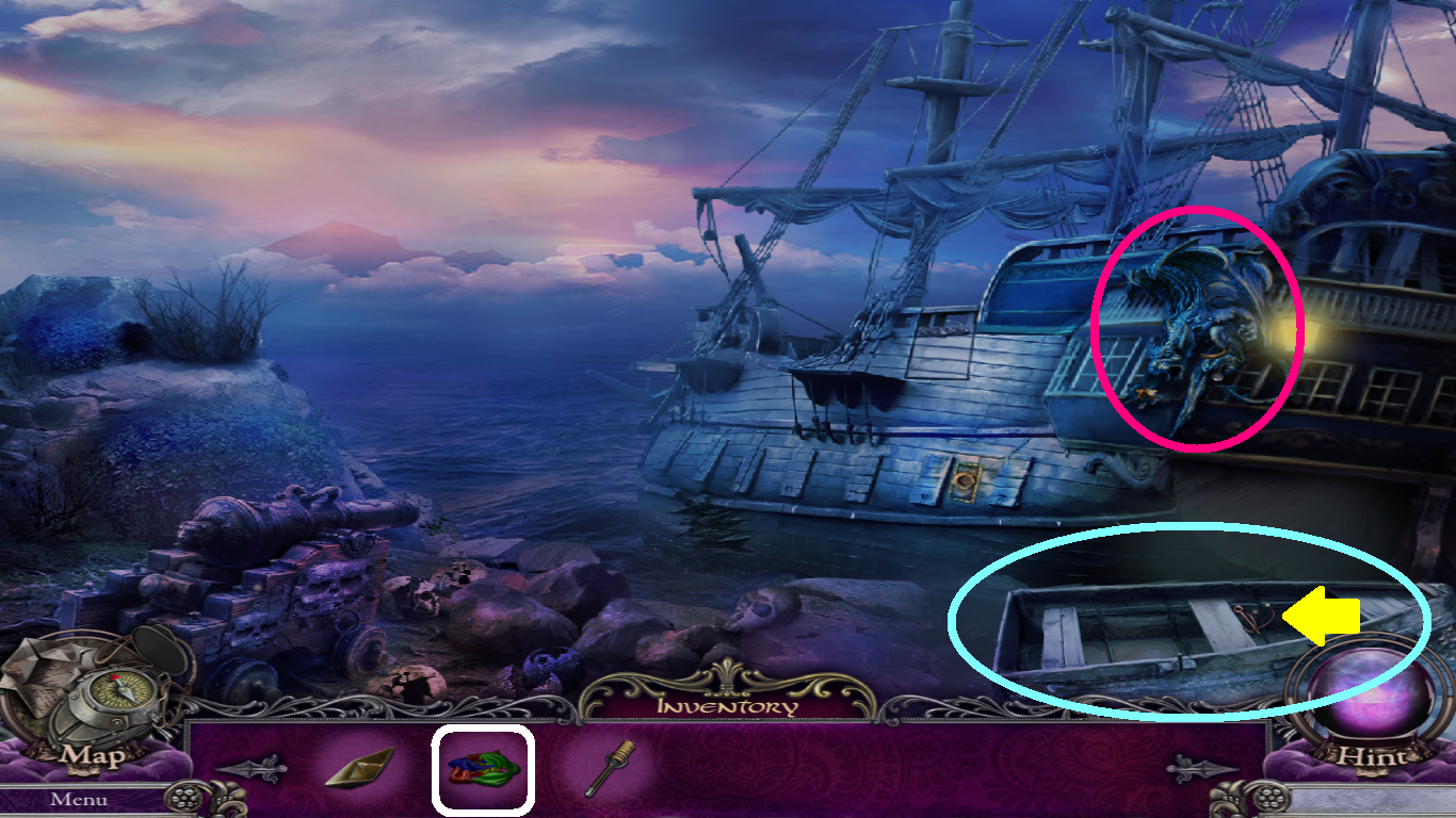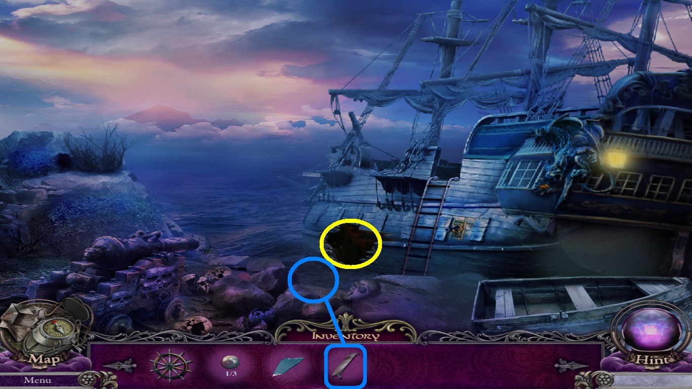- Select the ironing board (blue square) from the inventory; place it across the boulders and the hole in the ship (blue circle).