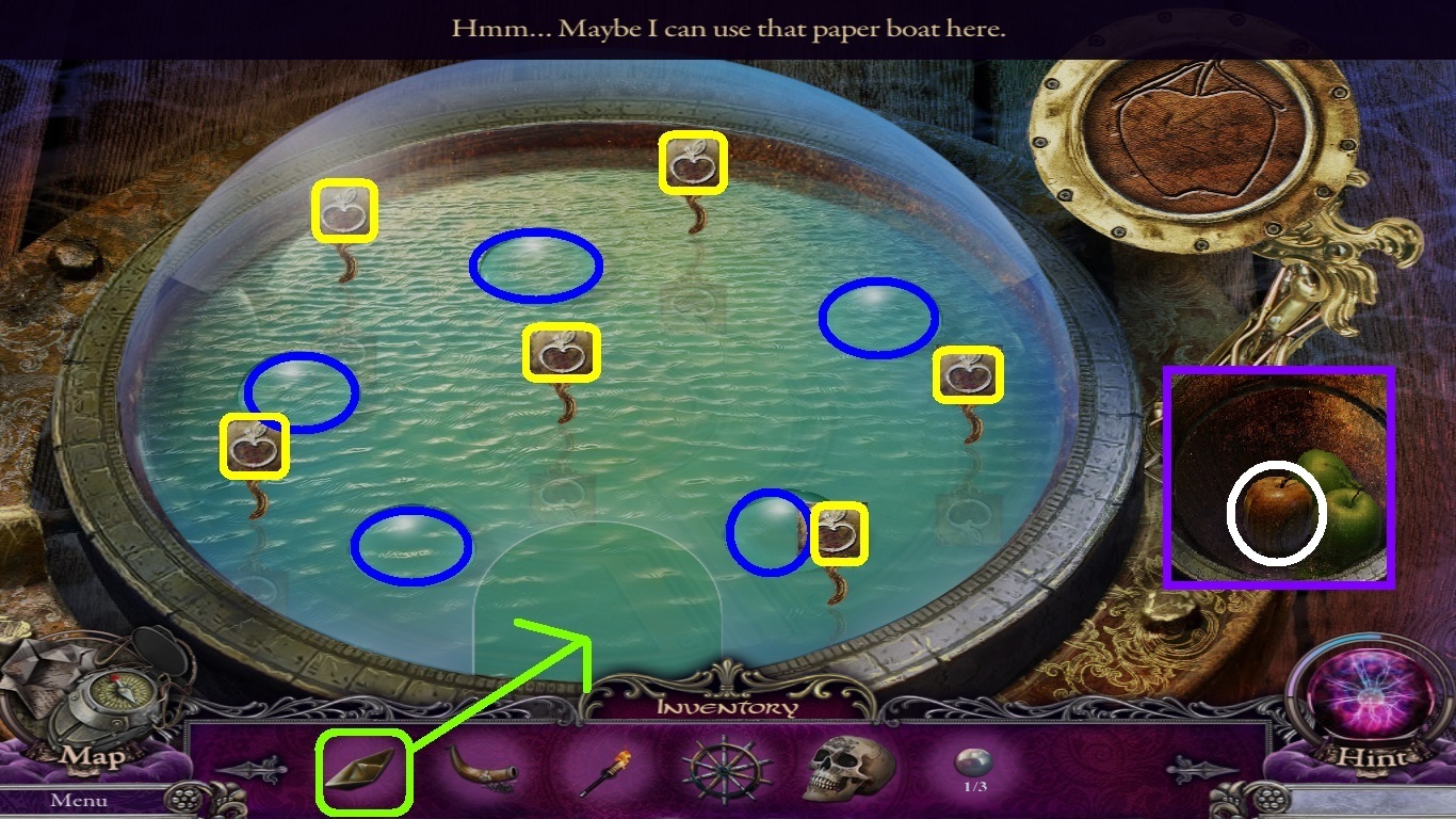 - Select the paper boat (green square) from inventory; place it into the opening.