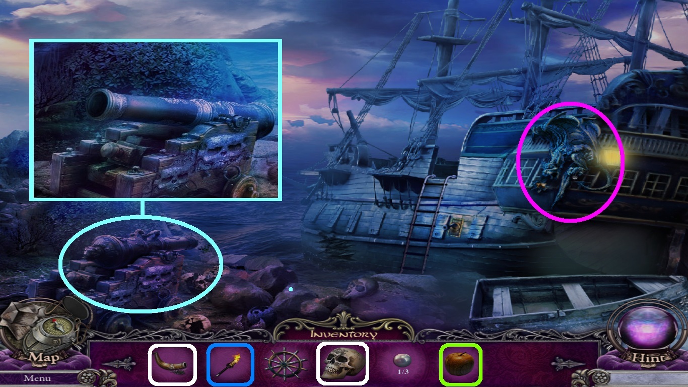 - Select the gun powder and the skull (white squares) from the inventory; place them into the opening of the cannon.