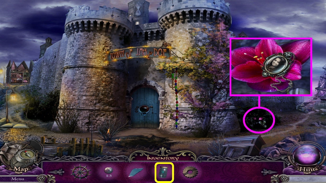 - Select the butterfly in the jar (yellow square) from the inventory; use it on the flower.