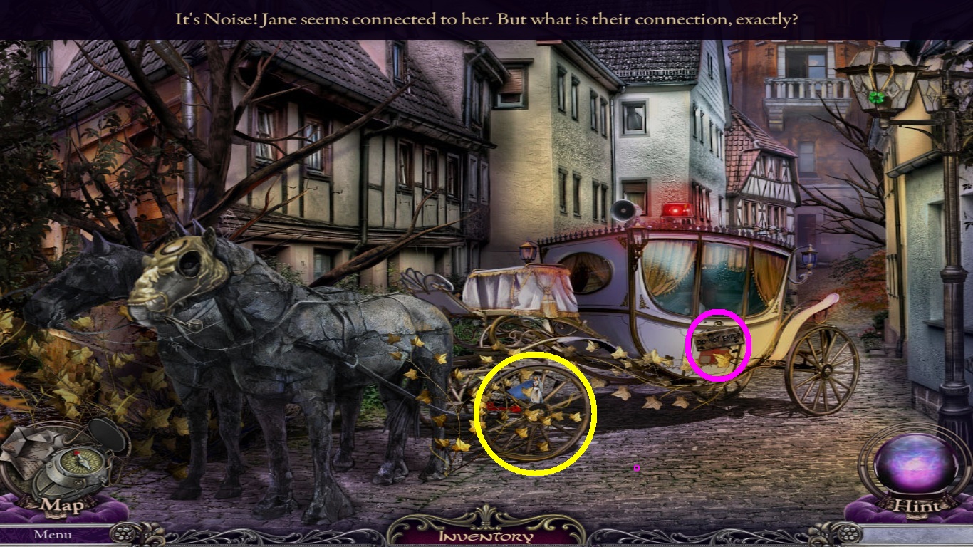- Zoom into the street lamp (aqua circle); pick up the good luck medallion.