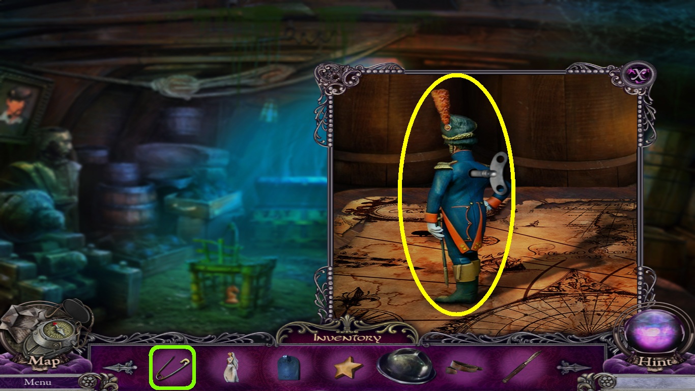 - Pick the wind up key (yellow square) from the inventory; use it on the lock.