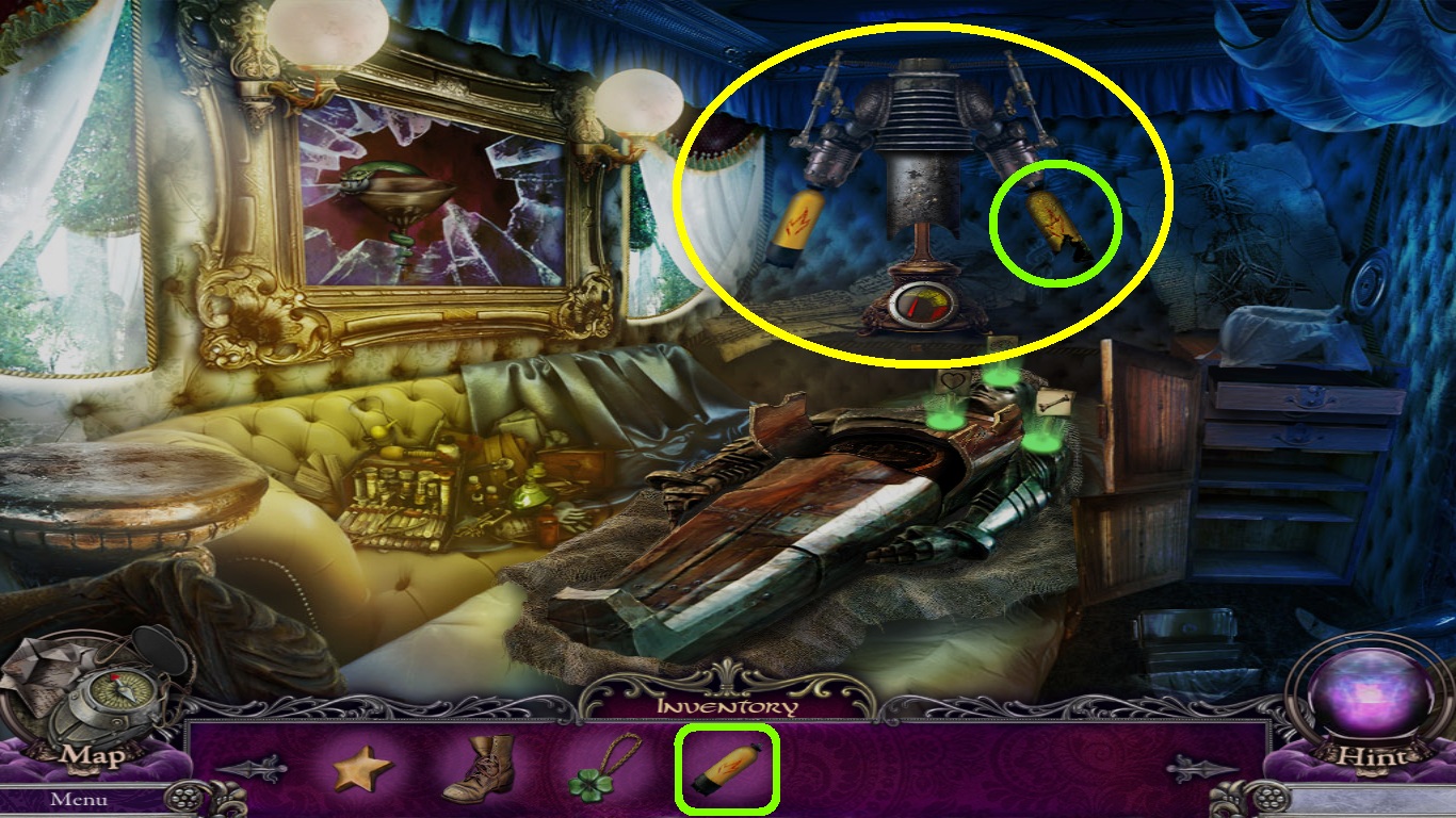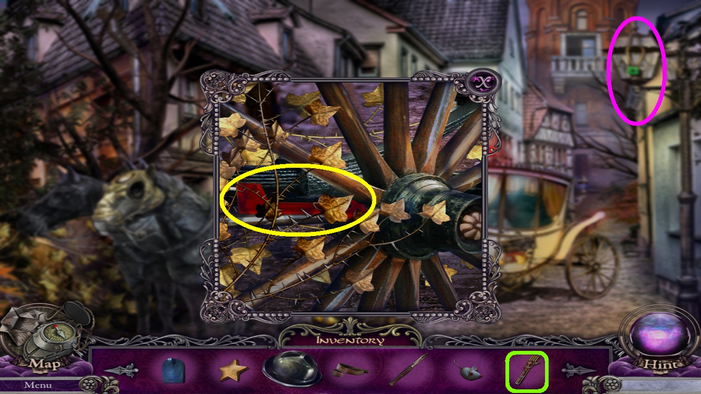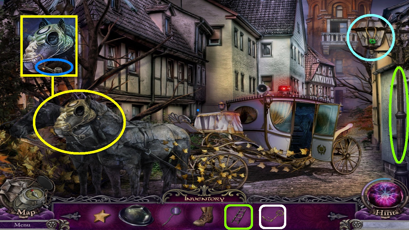 - Select the ladder (green square) from the inventory; place it on the lamppost (green circle).