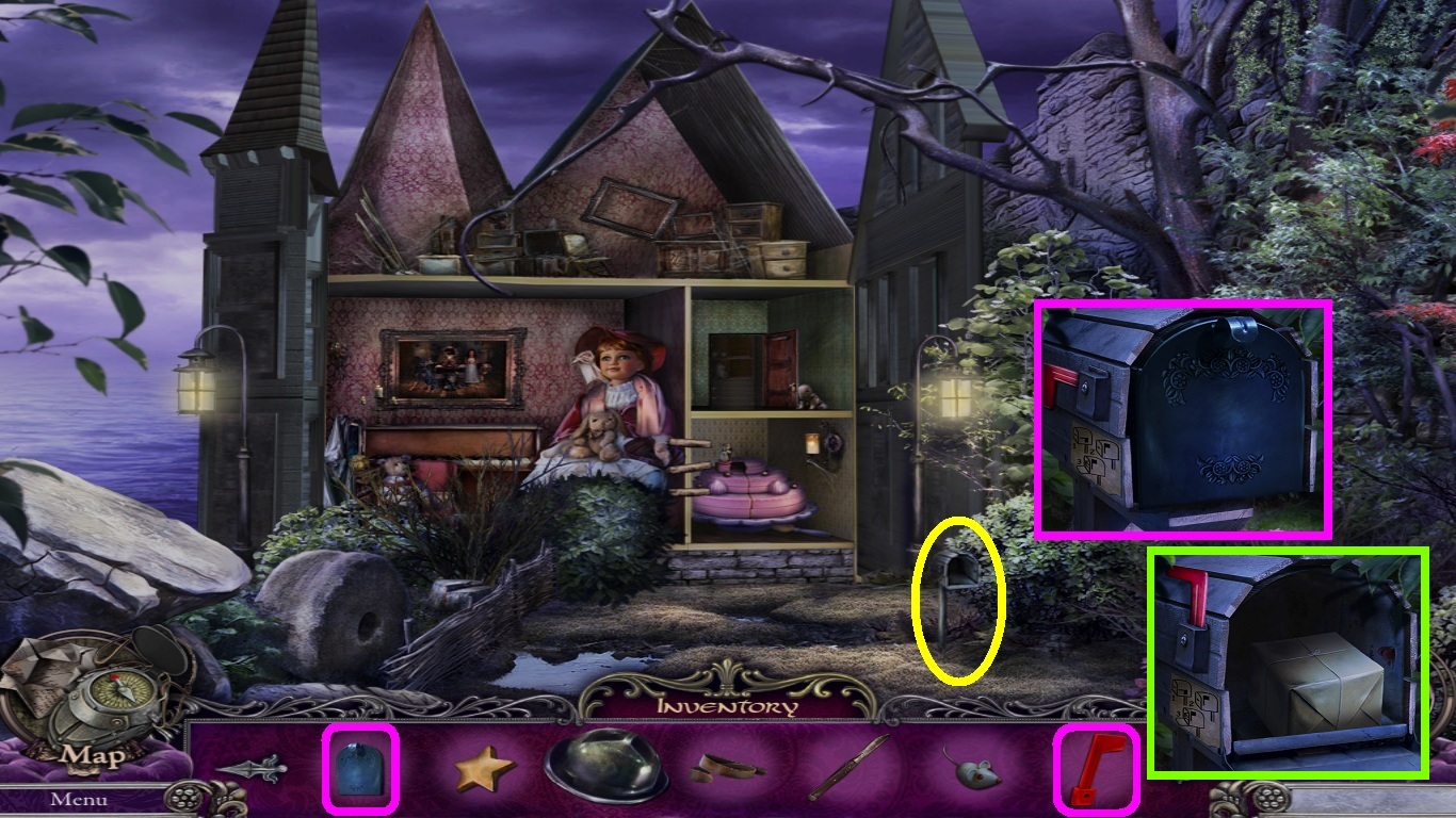 - Select the mailbox door and flag (pink squares) from the inventory; place both items on the mailbox (pink square).