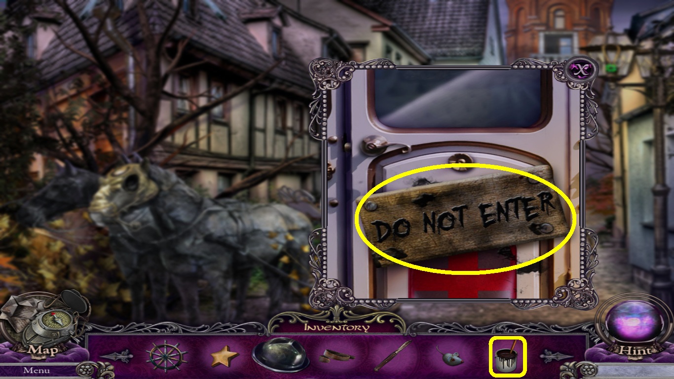 - Select the black paint (yellow square) from the inventory; use it on the sign (yellow circle).